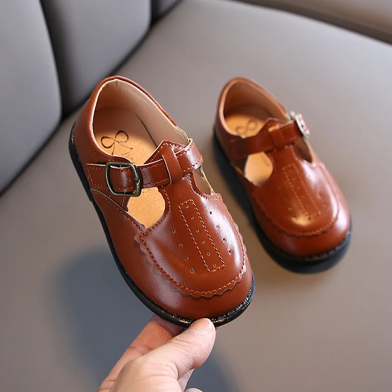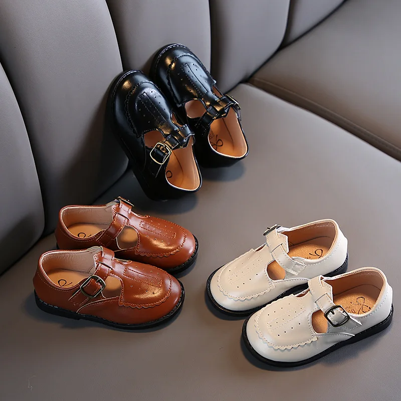 Туфли Детские демисезонные кожаные, с Т-образным ремешком, Нескользящие, черные, белые, коричневые
