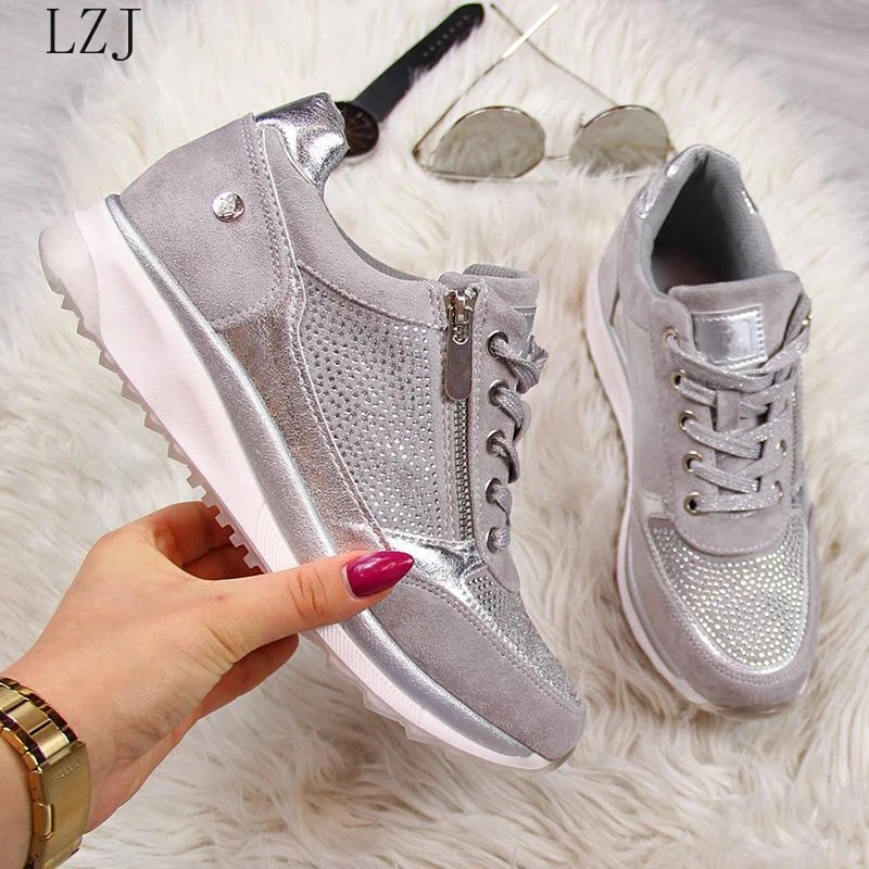 Женские кроссовки на танкетке, Вулканизированная подошва, со стразами, спортивная обувь для девочек, женская обувь, 2020