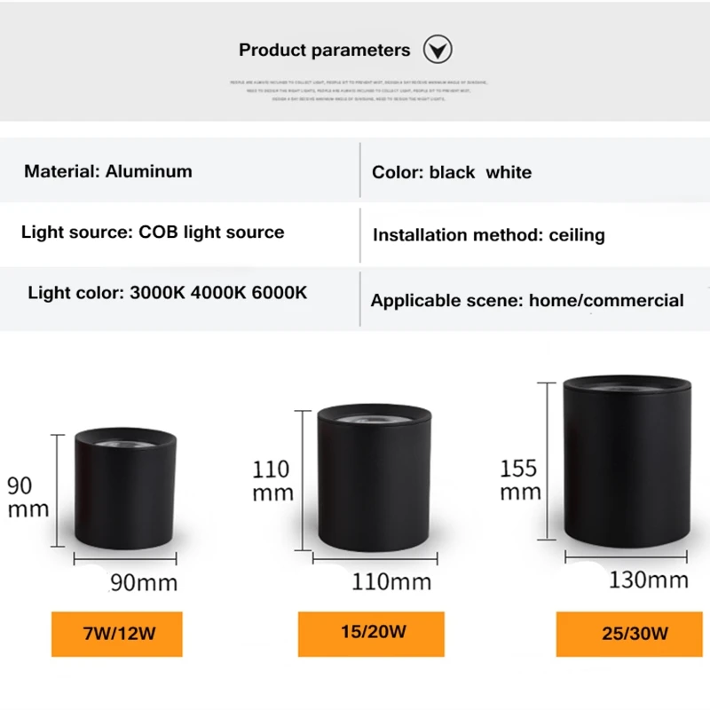 Вход напряжение: AC85 ~ 265V / 110V / 220V 50 / 60Hz Мощность: 7 Вт 12 Вт 15 Вт 20 Вт 25 Вт 30 Вт Затемнения опционально Индекс цветопередачи (CRI):> Ra90 Угол луча: 30 ° светодиодный Чип COB Световой поток: 95 ~ 110 лм/Вт Температура: от-25 до 45 ° Цветовая температура: теплый белый: (2700K-3000K); Натуральный белый: (4000K-4200K); Холодный белый: (6000K-6500K) Срок службы: 50000 ~ 80000 часов Сертификация: CE / RoHS / FCC / 3C Гарантийный срок: 4 года Материал: литой алюминий + линзы Происхождение: Гуандун (Китай)