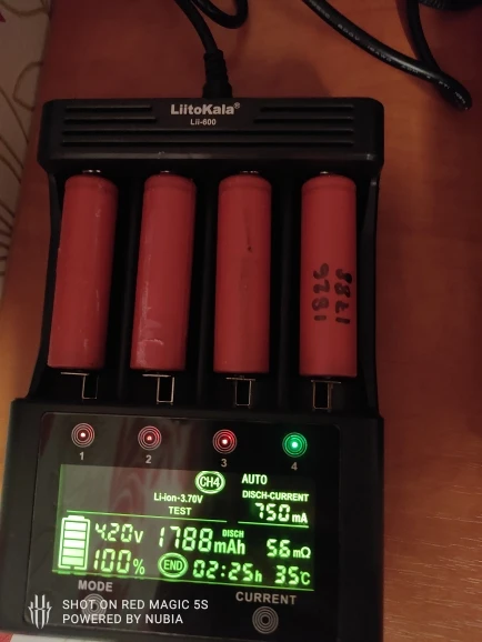 Отличное умное устройство для зарядки. Доставка быстрая, упаковано в собственную коробку и пакет. Качество очень хорошее. Информационно все показывает, включая % остатка заряда и сопротивление. Зарядка 250-3000ma, каждый слот отдельно. При зарядки горит красный светодиод, по окончании - загорается зелёный, со звуковым сигналом. Инструкция на русском языке есть.