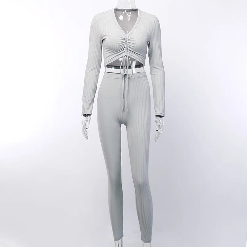 Трикотажный серый спортивный костюм в рубчик, пикантный короткий топ с длинным рукавом и V-образным вырезом и леггинсы, модная однотонная эластичная уличная одежда, комплект из двух предметов