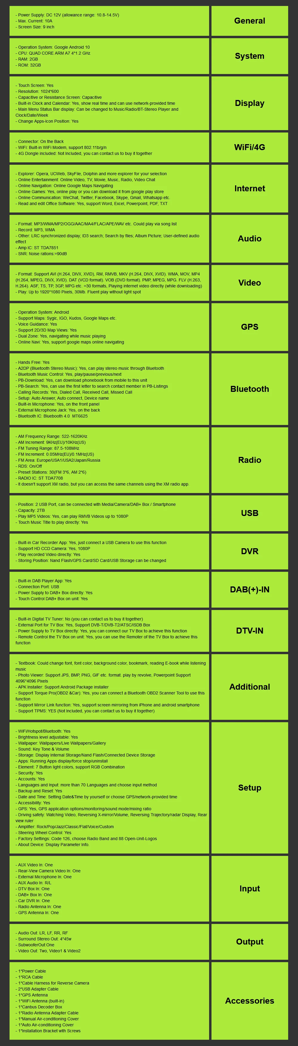 1024*600 9 дюймов Android 10 48Core DSP 2 + 324 + 64 1Din Автомобил...