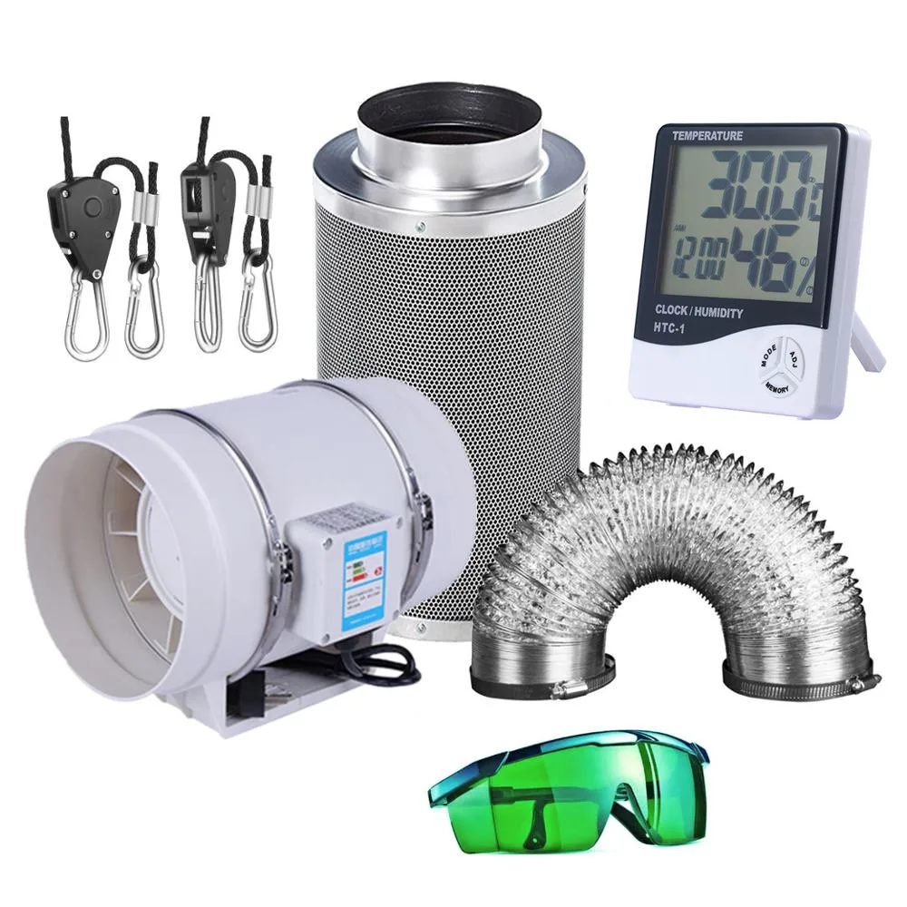 -Воздуховод вентилятор для зеленого дома растут палатки гидропоники X 1-Высокоэффективный активированный карбод воздушный фильтр X 1-Выхлопная труба X 1-Регулируемая Тяжелая веревка-ХРАПОВИК-вешалка X 2-Хомуты для шланга X 2