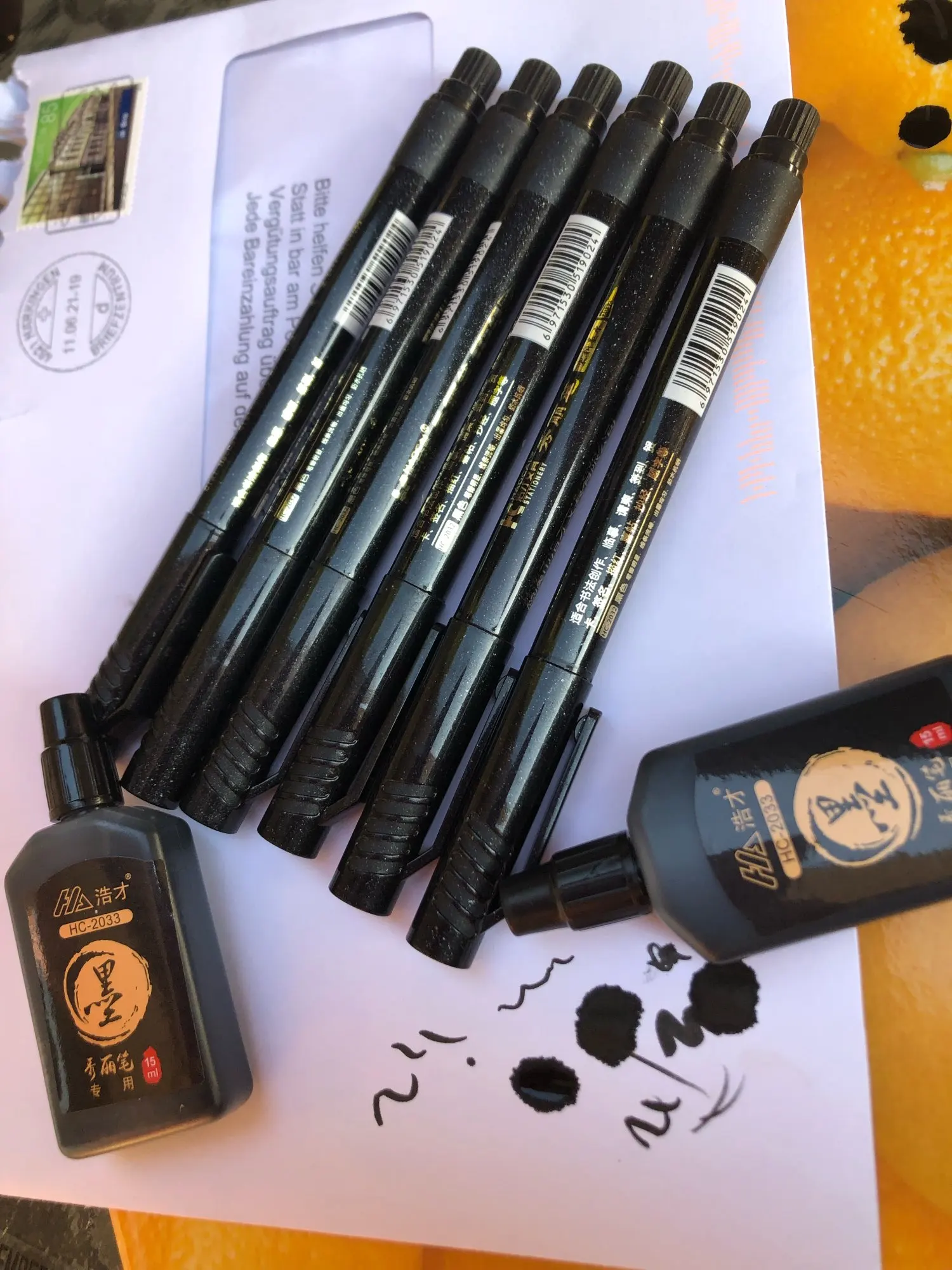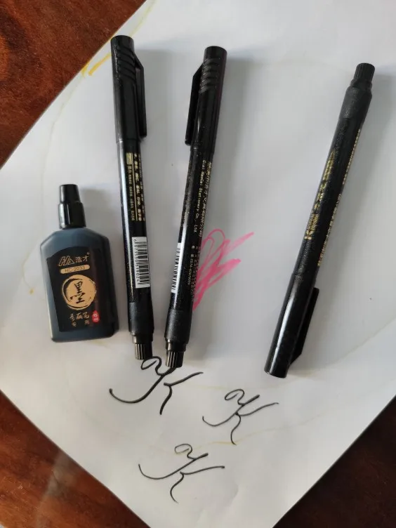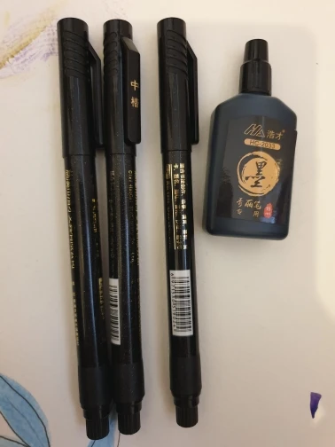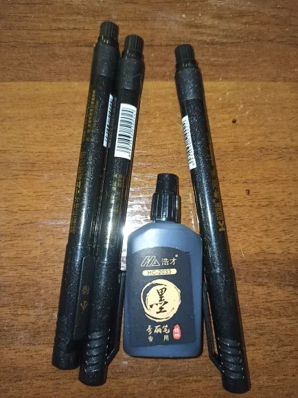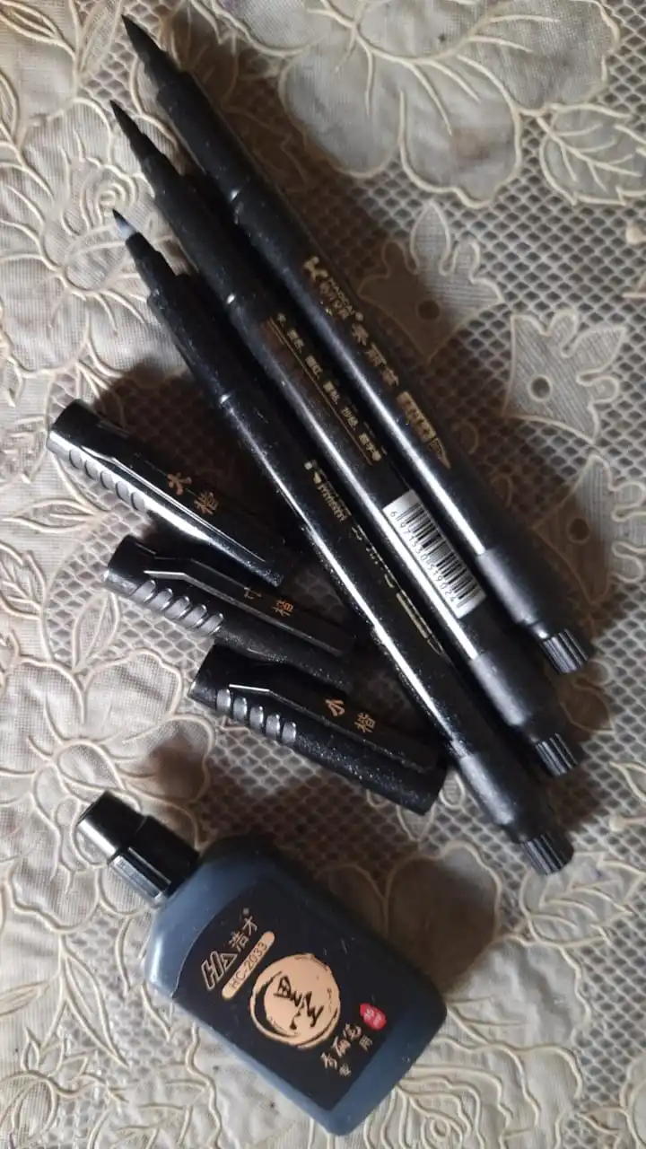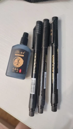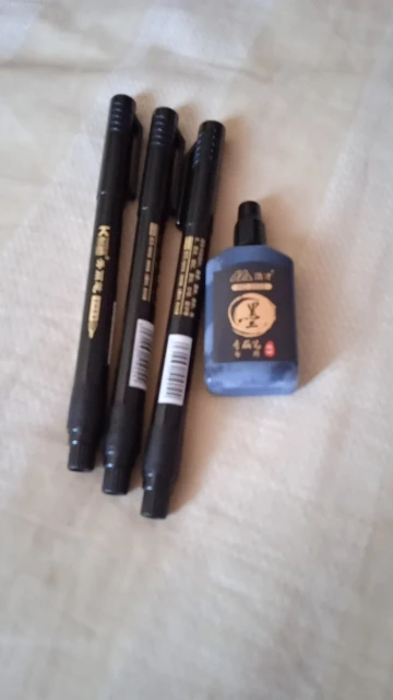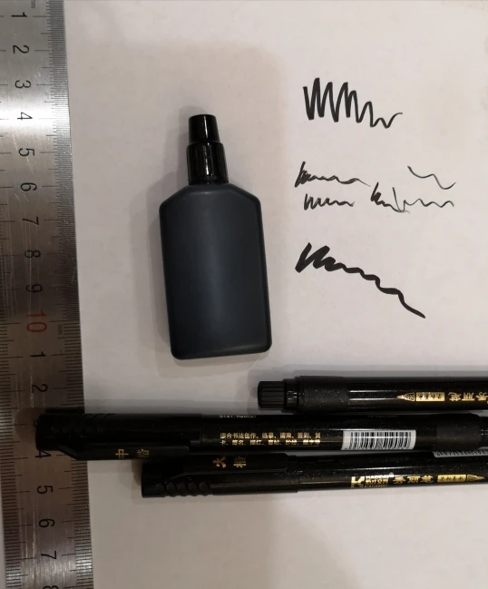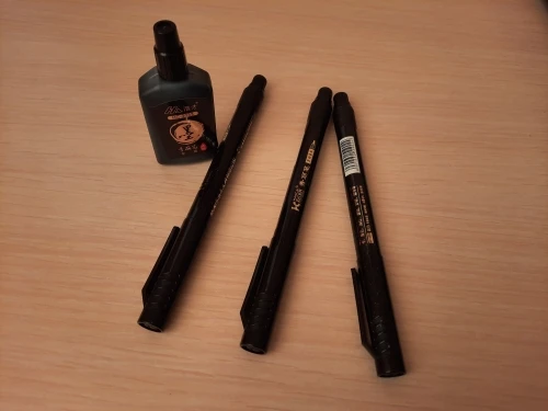 Доставка заняла : 29.03.- 05.05. Баночка с чернилами очень маленькая, и есть ли там 15 мл не проверить... Маркеры пишут, жирно пишет ручка браш_пэн, самая тоненькая царапала как-то, вроде расписалась. Эти чернила не чисто чёрного цвета.* Если кому-то нужно что-то подписывать не столь важное, то подойдёт, также для тренировок каллиграфией или... Тест на обычном белом листе бумаги 80 г/м2 - эти ручки не протекли через бумагу, лишь немного просвечивают с другой стороны. Кому важно, после написания, если потереть лист через некоторое время, чернила на руках не остаются, а вот если провести мокрой рукой, то размазывается написанное на листе - не водостойкие. У продавца написано, что это пигментированные чёрные чернила - это НЕ так! * В целом, всё хорошо, обычные маркеры. Заправлять ещё не пробовали.