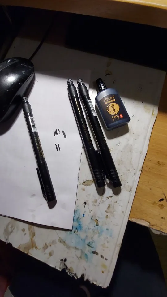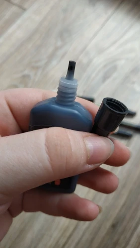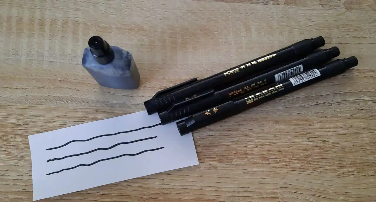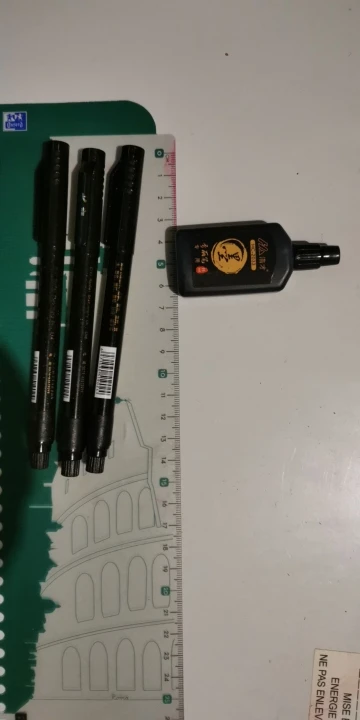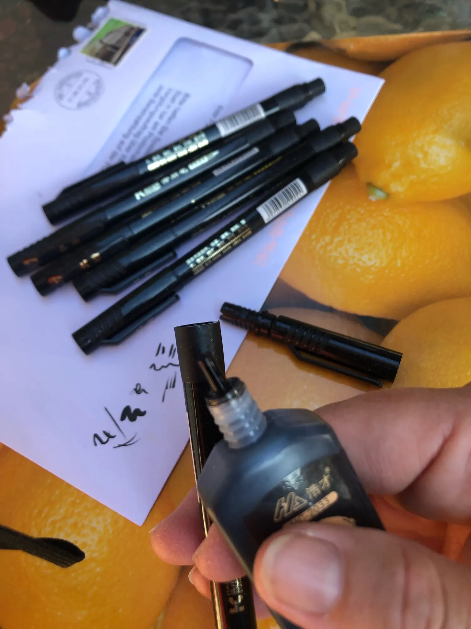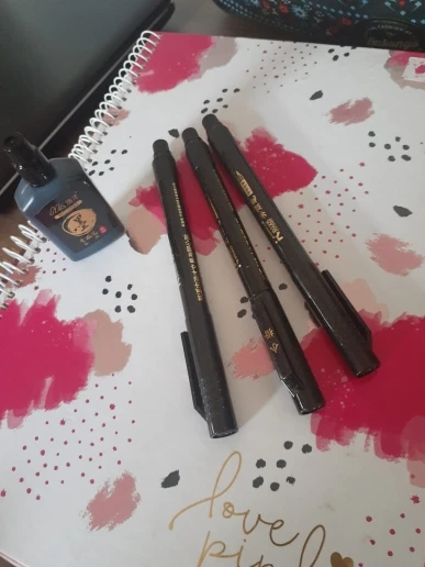Доставка заняла : 29.03.- 05.05. Баночка с чернилами очень маленькая, и есть ли там 15 мл не проверить... Маркеры пишут, жирно пишет ручка браш_пэн, самая тоненькая царапала как-то, вроде расписалась. Эти чернила не чисто чёрного цвета.* Если кому-то нужно что-то подписывать не столь важное, то подойдёт, также для тренировок каллиграфией или... Тест на обычном белом листе бумаги 80 г/м2 - эти ручки не протекли через бумагу, лишь немного просвечивают с другой стороны. Кому важно, после написания, если потереть лист через некоторое время, чернила на руках не остаются, а вот если провести мокрой рукой, то размазывается написанное на листе - не водостойкие. У продавца написано, что это пигментированные чёрные чернила - это НЕ так! * В целом, всё хорошо, обычные маркеры. Заправлять ещё не пробовали.