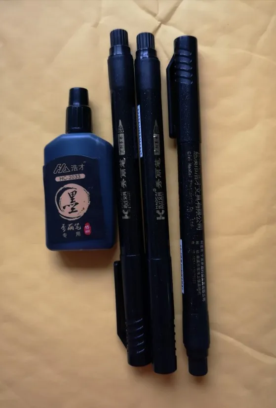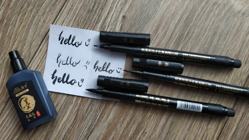 Отличные недорогие кисточки. Ворс ровный, нигде не топорщится, пишут ровно. Кисточки заправлены, несмотря на прилогающийся балончик туши. Колпачки тугие, не откроются случайно. Действительно открываются и можно заправлять. Бутылочка с тушью маленькая на 15 мл. и похоже тоже можно вскрыть и заполнить заново. Её тоже можно брать с собой.