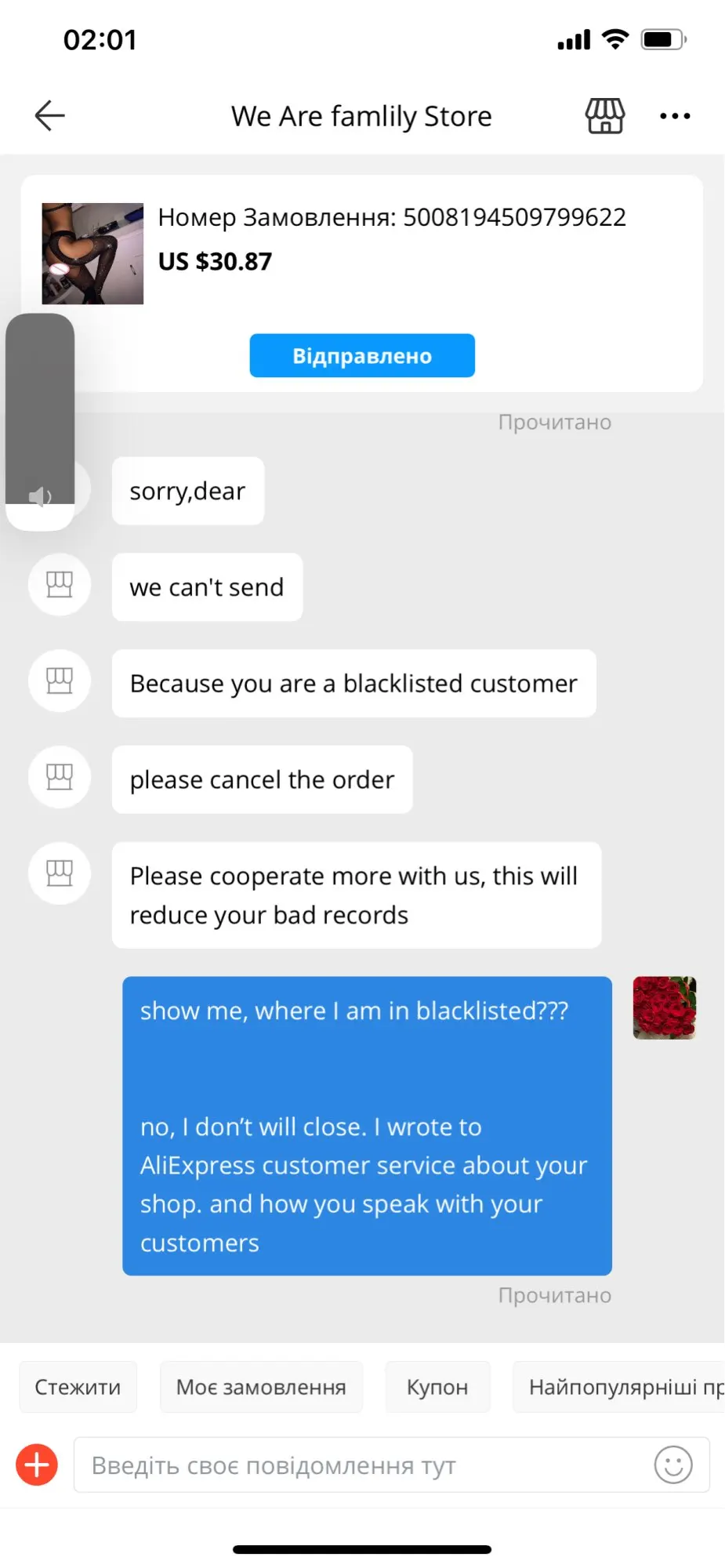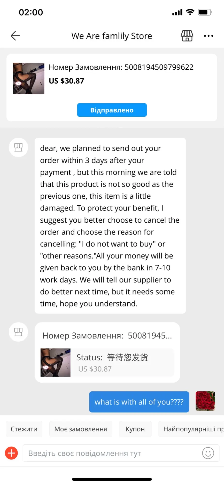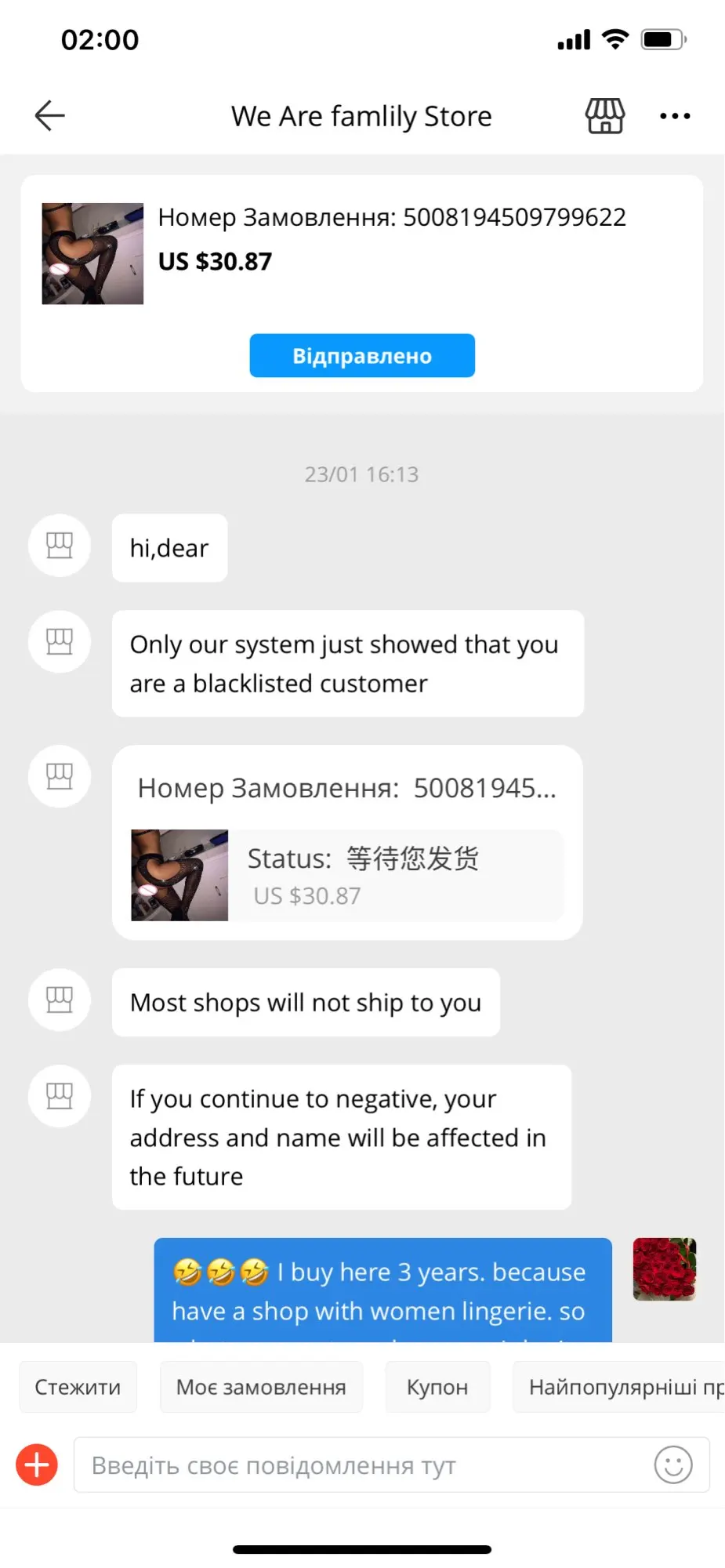 Шахрай!!! Не замовляйте тут. Нехай Алі закриють його магазин. Зробила замовлення на 15шт, пише мені продавець- якість погана, відміни замовлення(фото додаю). Відміняти я не хотіла так як втрачаю гроші ізза конвертаціі гривні у долари. Це я йому написала, на що отримала- ти тут в чорному списку, і ніхто нічо тобі не відправить. А чоловік пояснив це так, вони бояться що при отриманні ти напишеш поганий відгук відкриєш суперечку і виграєш її так як у мене тут найвищий «діамантовий» рівень (вже за 3 роки). Так ми переписувались до кінця терміну відправки. А потім цей ШАХРАЙ дав лівий трек номер, і зараз я ще й повинна відкривати спір і чекати повернення коштів. Я вважаю що таким магазинам не місце тут. Не давайте шанс на розвиток таким поганим магазинам і хитрим продавашкам.