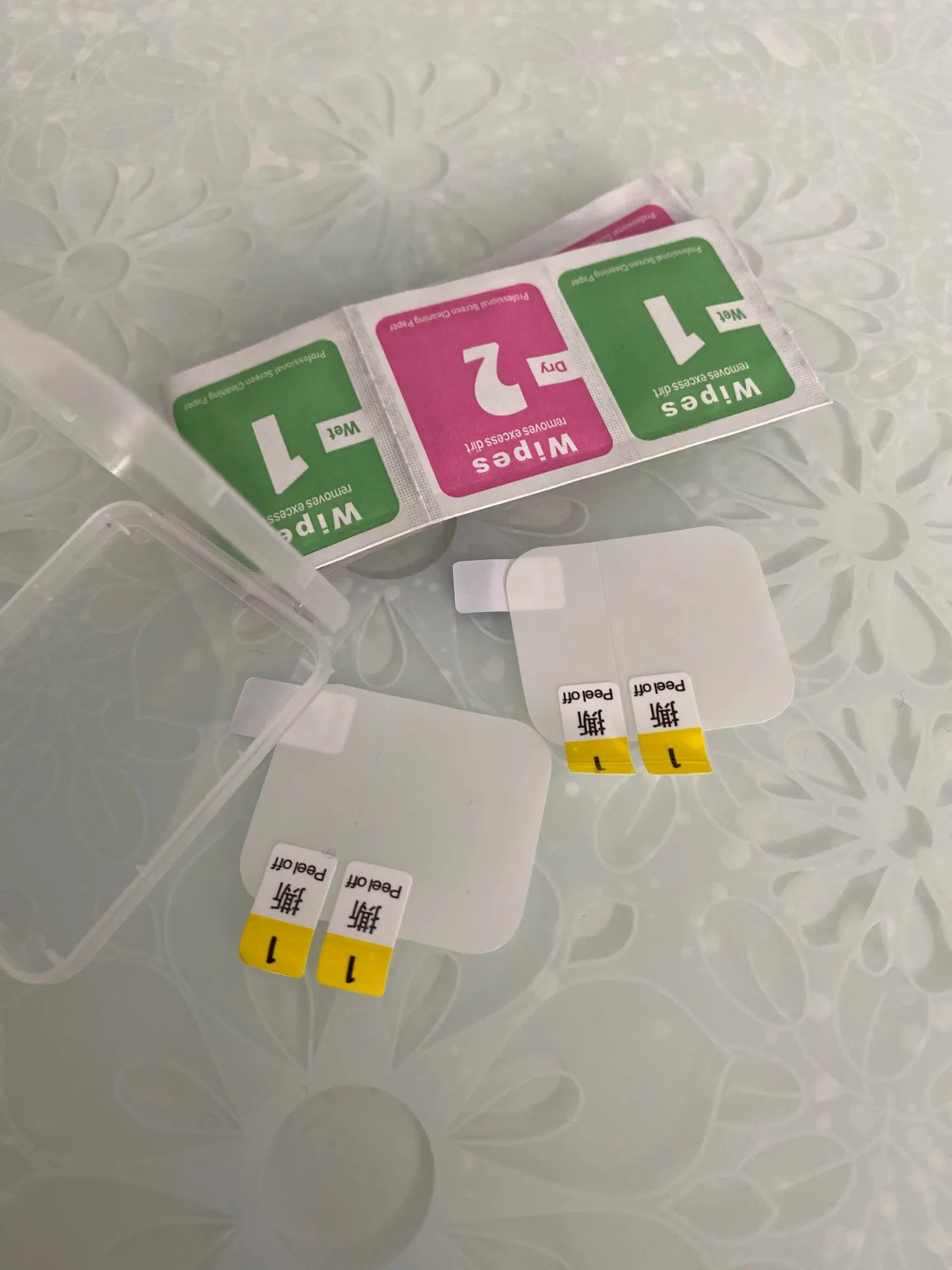 Плёнка не такая, как на фото. У неё выемки по углам, видимо для лучшего прилегания, но по факту образовуются острые уголки, которые зацепляются за все подряд, и туда попадает пыль. Наклеивается не пойми как, из трёх штук более или менее наклеила с третьей попытки