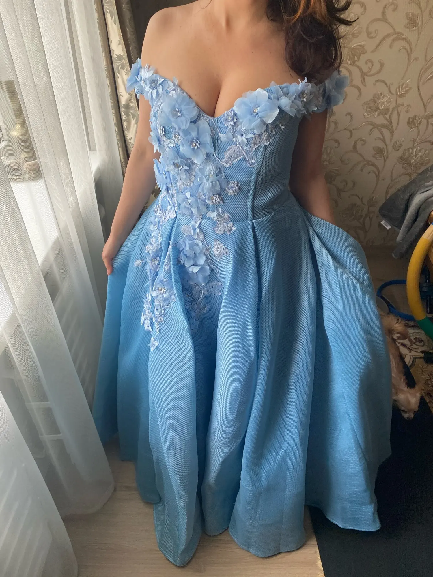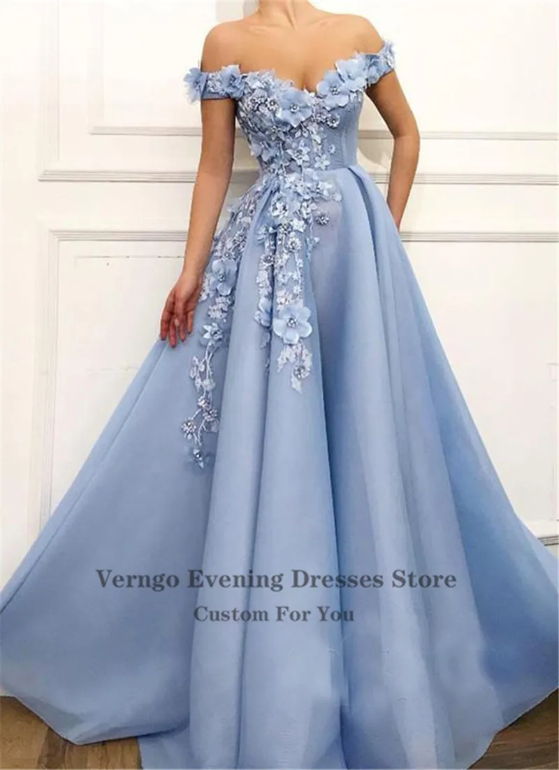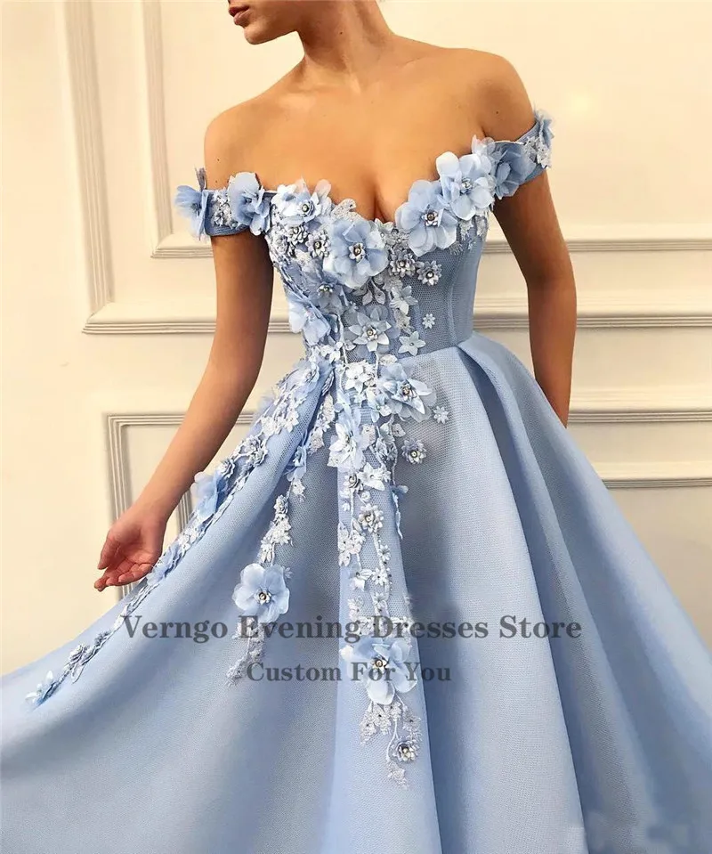 Платье-трапеция с 3D цветами, с открытыми плечами, для выпускного вечера, Verngo, элегантное голубое небо