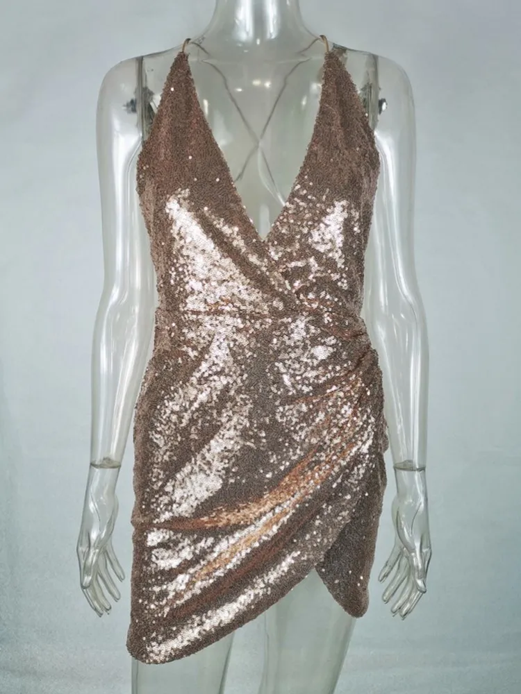 Женское блестящее мини-платье, с V-образным вырезом и открытой спин...