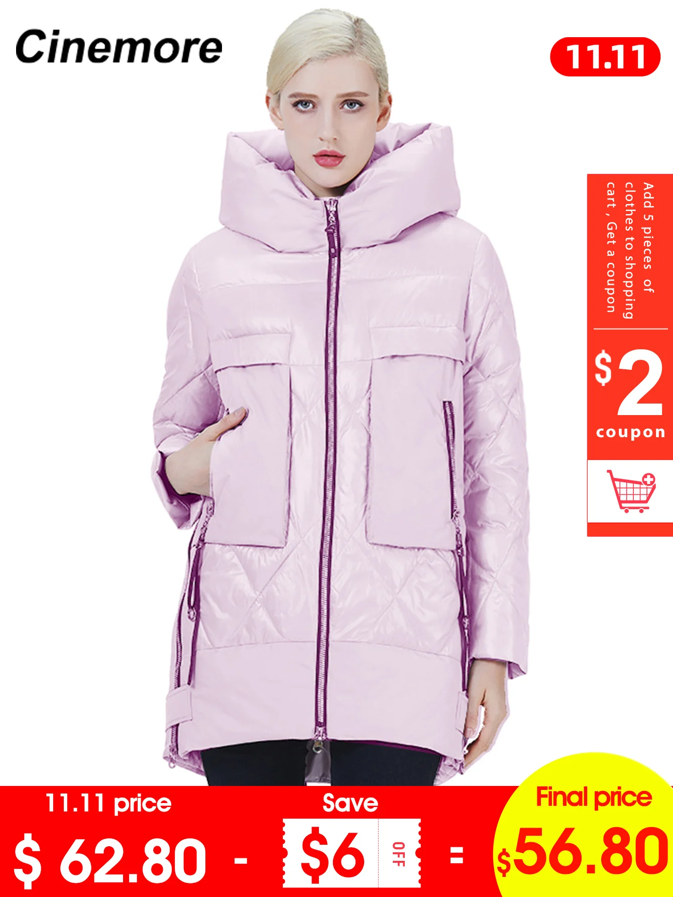Женский зимний пуховик, сиреневый цвет, с карманами, стандартная длина, 2020