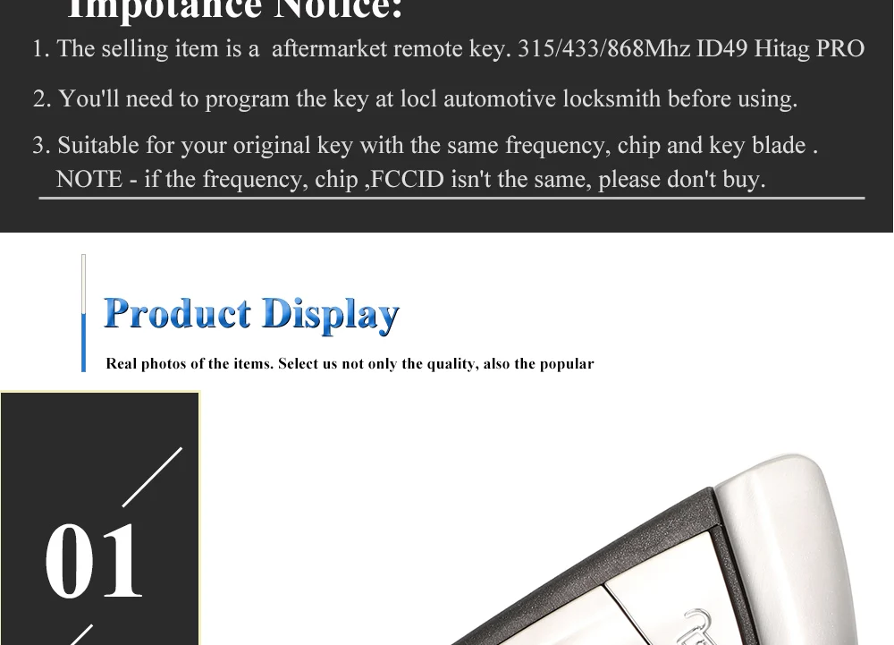 Качество этого ключа очень хорошее. Я бы даже сказал, что он не отличается от ключа OEM. Обратите внимание, что ключ должен быть запрограммирован слесаром или другой не может быть использован. Я использовал этот ключ и сравнил его с частотой и моделью чипа с моим ключом F10. Мне нужен Спортивный Ключ M, и это прекрасно работает. Это второй ключ, который я заказал у этого поставщика. Он прибыл в ОАЭ в течение недели.