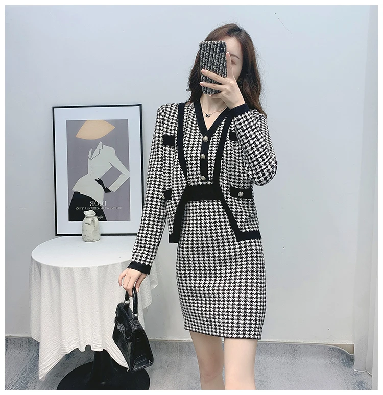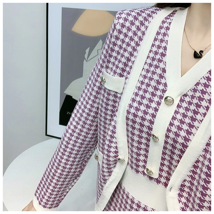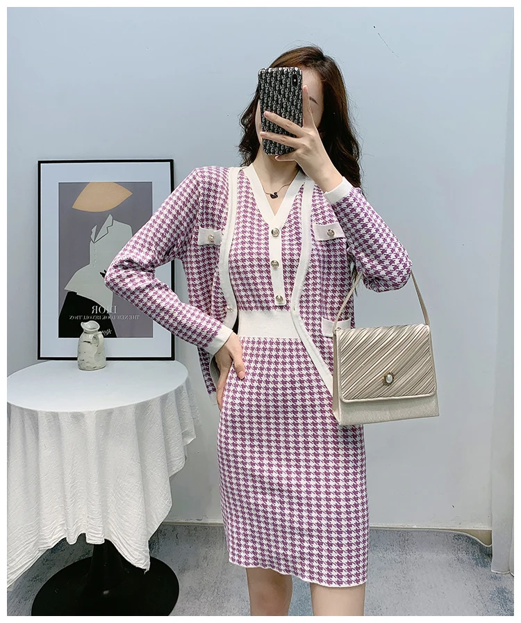 Женский трикотажный комплект из 2 предметов, фиолетовый свитер с рисунком гусиные лапки, кардиган, пальто и облегающее платье-футляр без рукавов, Осень-зима