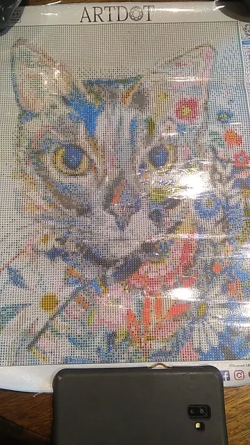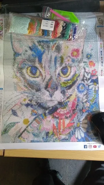 The kitty in square 30 x 40cm is the best diamond painting I have ever done. I love it so much. It was amazing to work on due to the glue being quite forgiving and the white grid, rather than black which usually shows through the diamonds. The diamonds were beautiful colours and quality. Would highly recommend this kit!