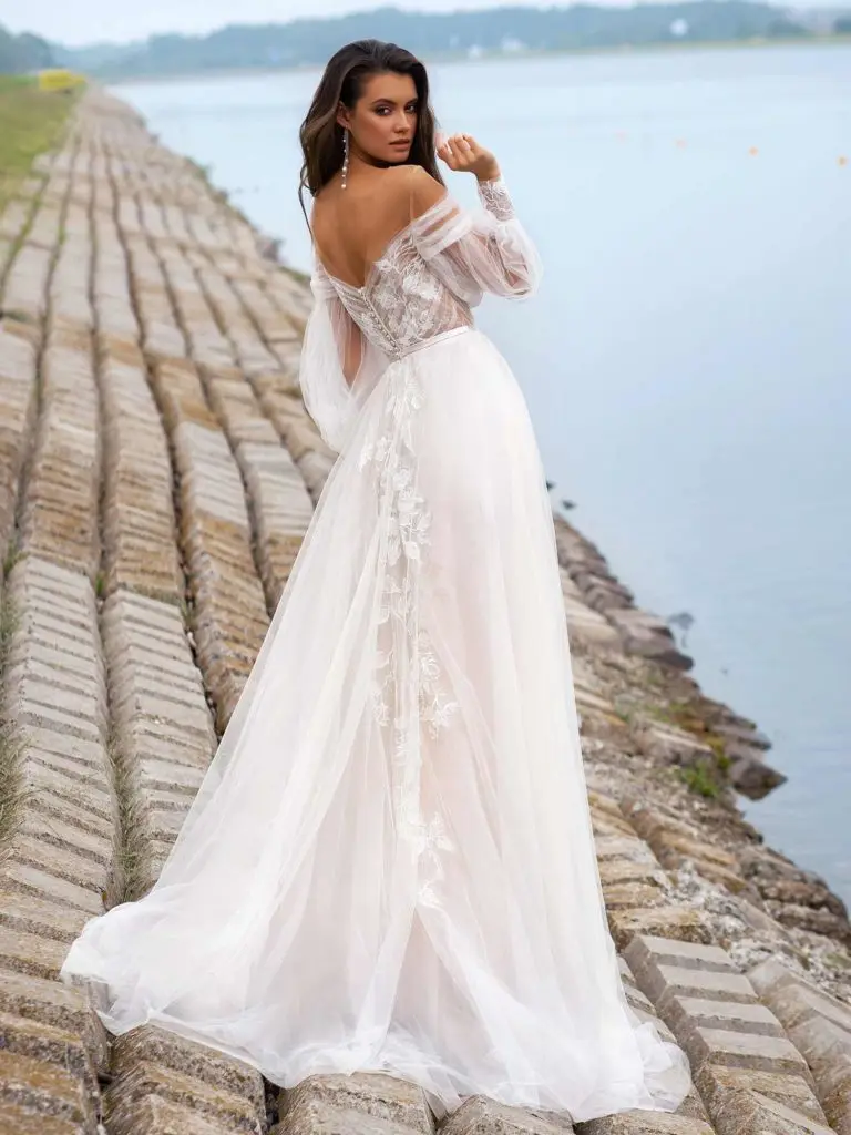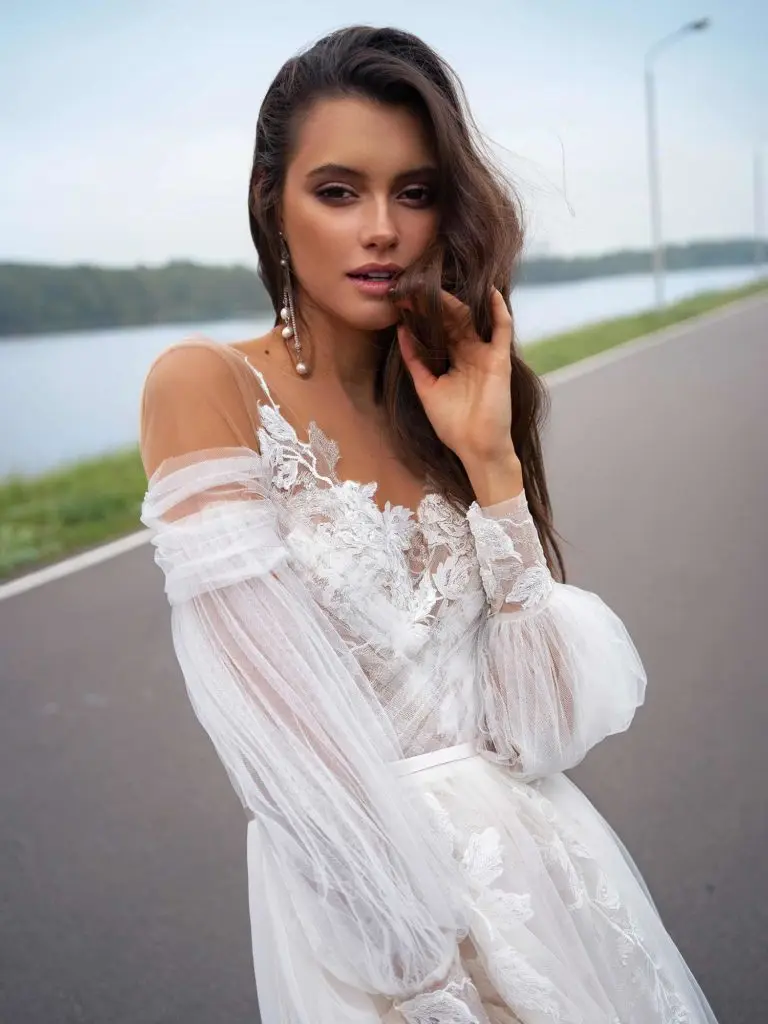 Свадебное платье в пол, из органзы, с V-образным вырезом
