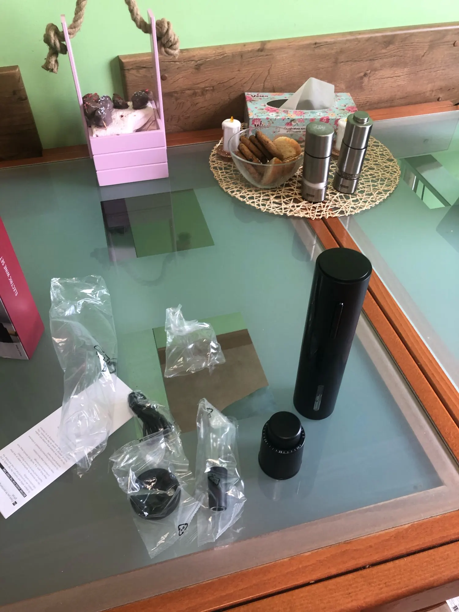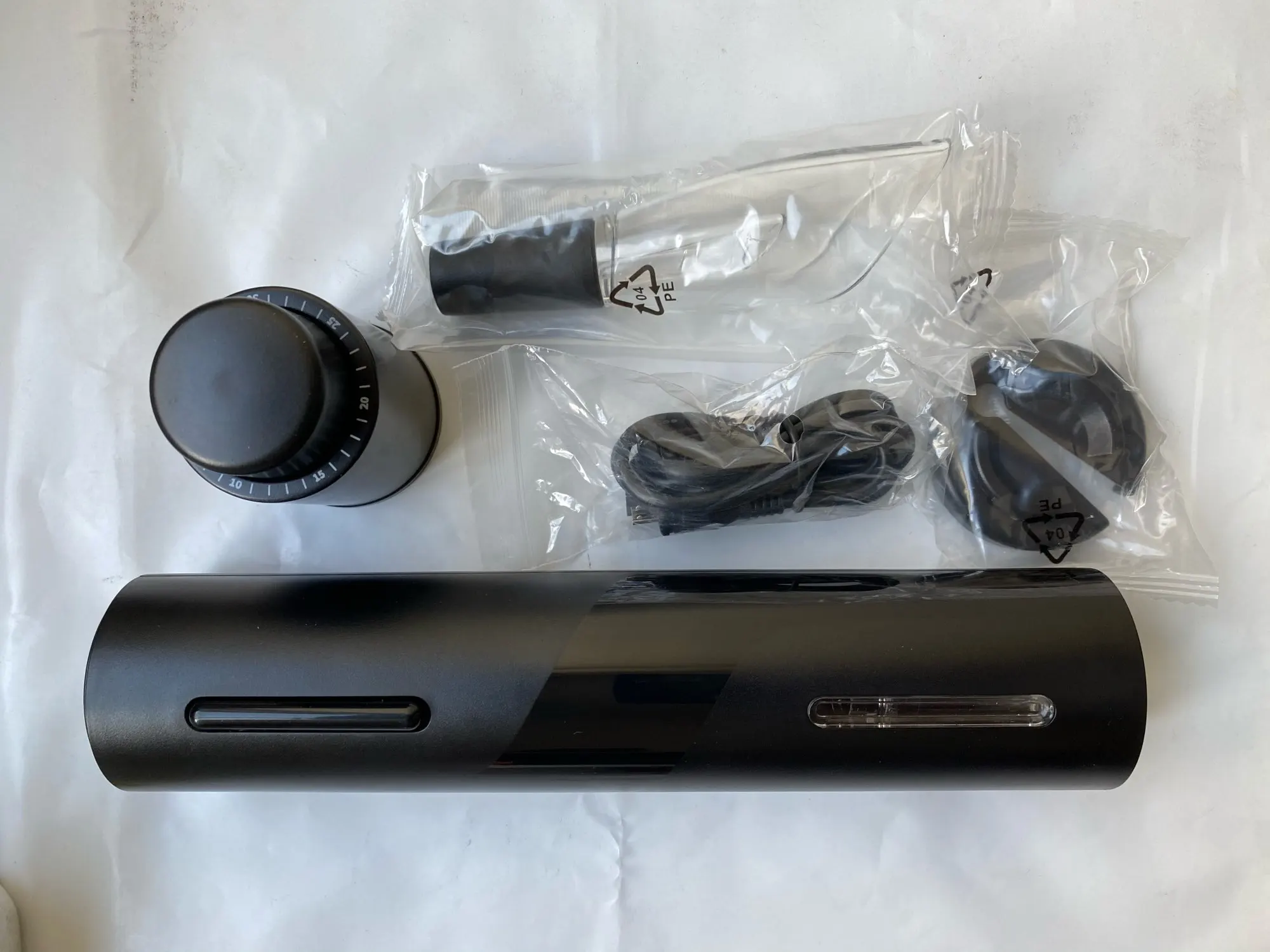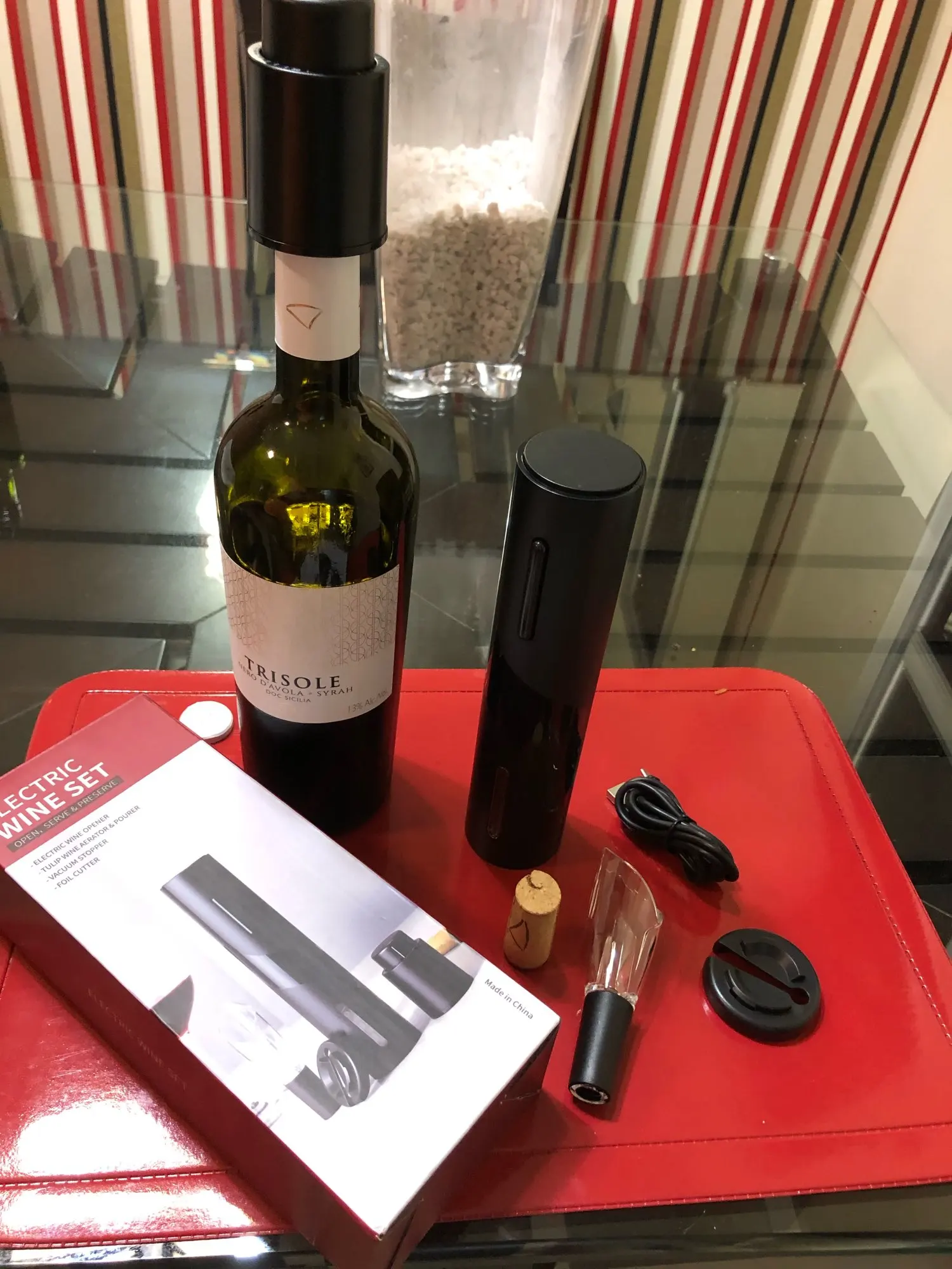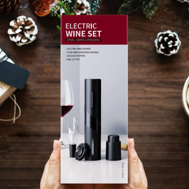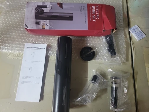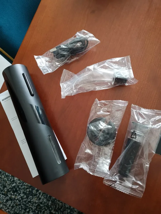 Купил полный набор. доставка очень быстро, всего пару дней. все предметы хорошего качества. зарядка произошла очень быстро. что работает, чётко - вынимает пробку из бутылки, а потом отдаёт её. Пробка, срезать от фольги и дозатор очень удобные, работают хорошо.