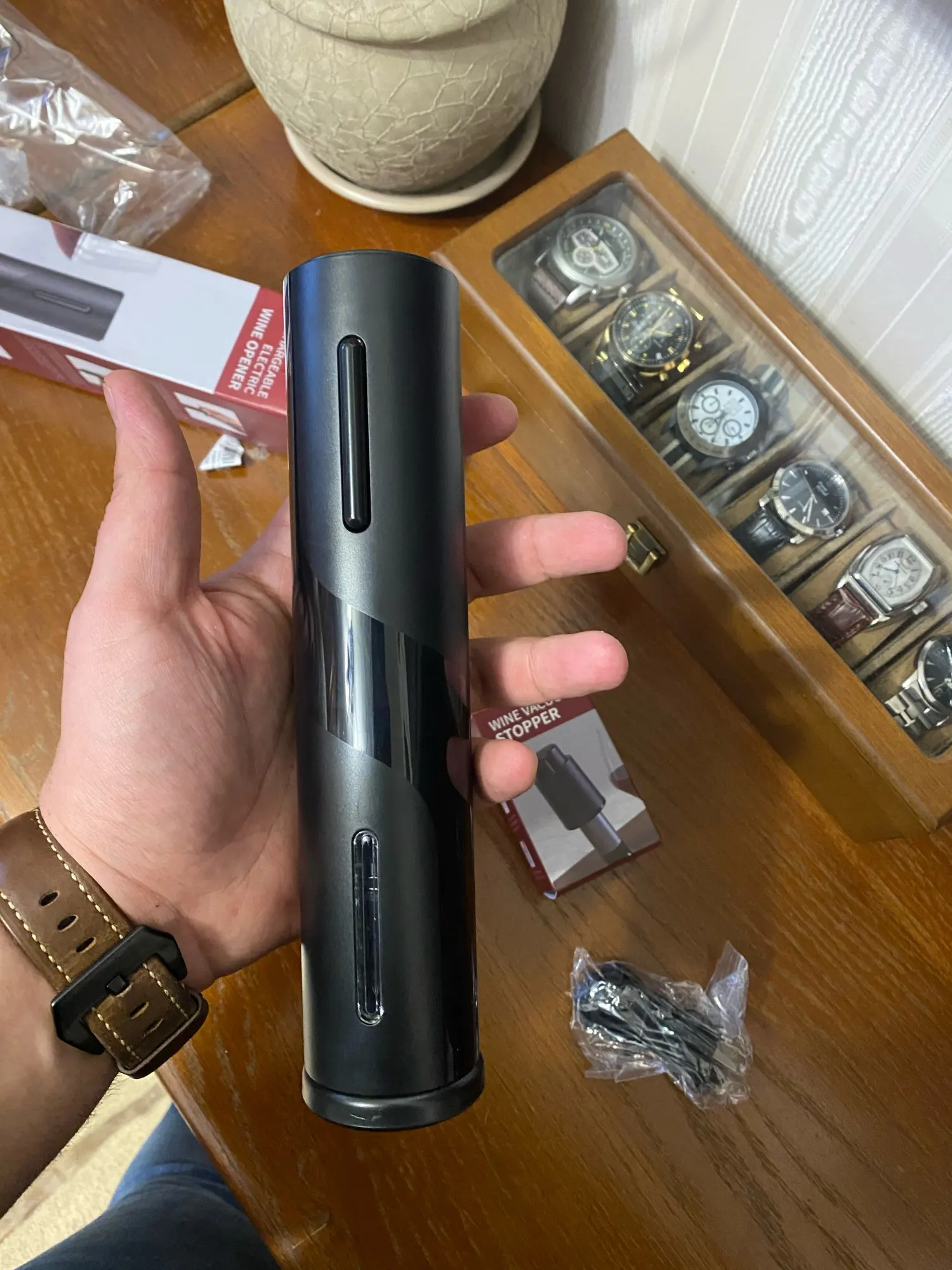 Я просто в восторге!! Это супер!!! Меньше минуты и вино открыто!!) я не ожидала что будет настолько круто, а главное не нужны батарейки, заряжается через провод! Если вы сомневались-берите, не пожалеете, это новый век открывания вина!))