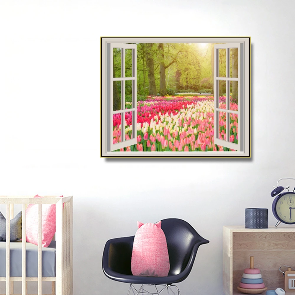 Постер на холсте, с изображением цветочного сада, пейзажа за окном