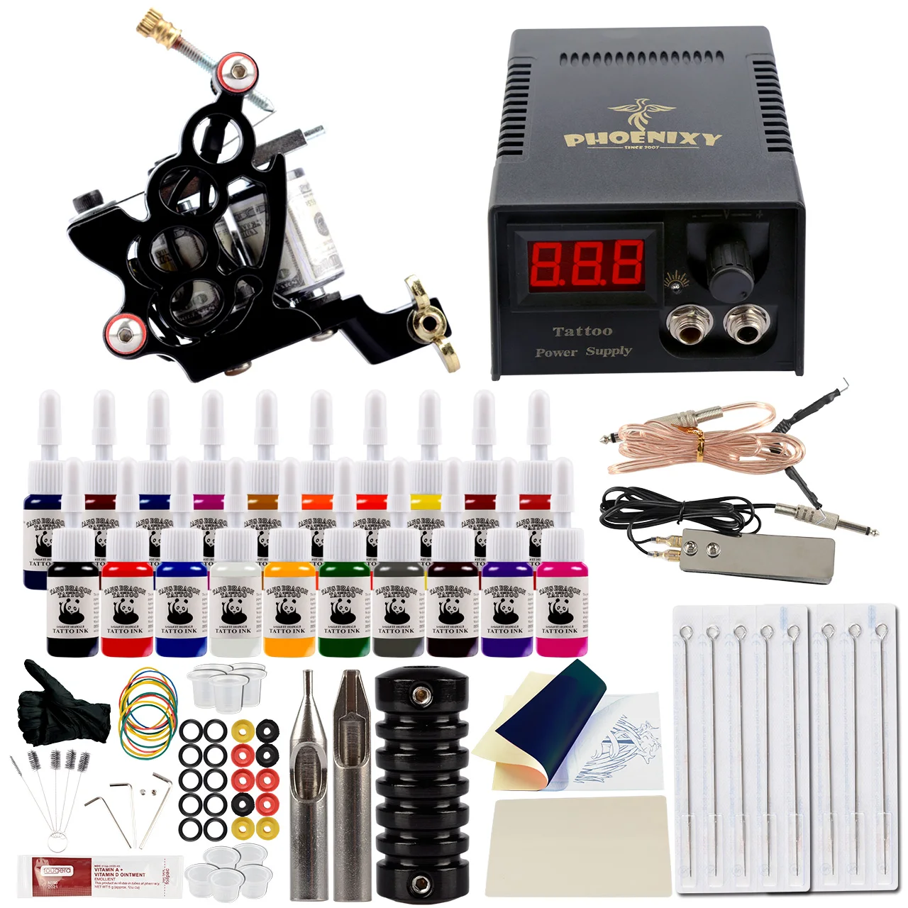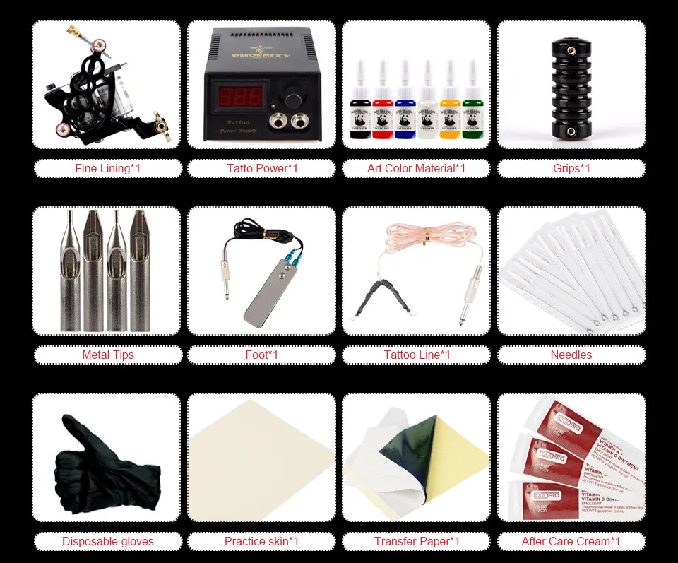 1 х топ тату машина для подкладки и затенения1 x Высококачественная ЖК-система питания, ножной переключатель и зажим2 x иглы из нержавеющей стали высшего качества10 x Высокое качество предварительно сделанные стерильные иглы татуировки1 x Высококачественная ручка для тату-машины1 × моделирование кожи1 × Бумага для переноса1 × специальные перчатки5 × Чистящая Щетка1 × мазь для ремонта10 x втулка держит иглу устойчивой10 x резиновых полос Avoide машина10 x уплотнительное кольцо уверенная пружина гладкая3 x набор инструментов регулировки для машины10 × чашка для пигментов10 цветных чернил для тату/1 чёрные Специальные чернила для тату 60 мл/20 цветных чернил для тату
