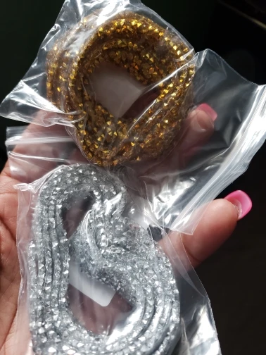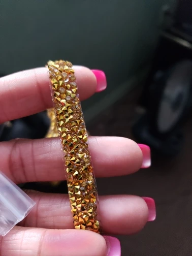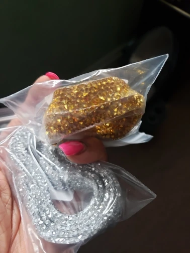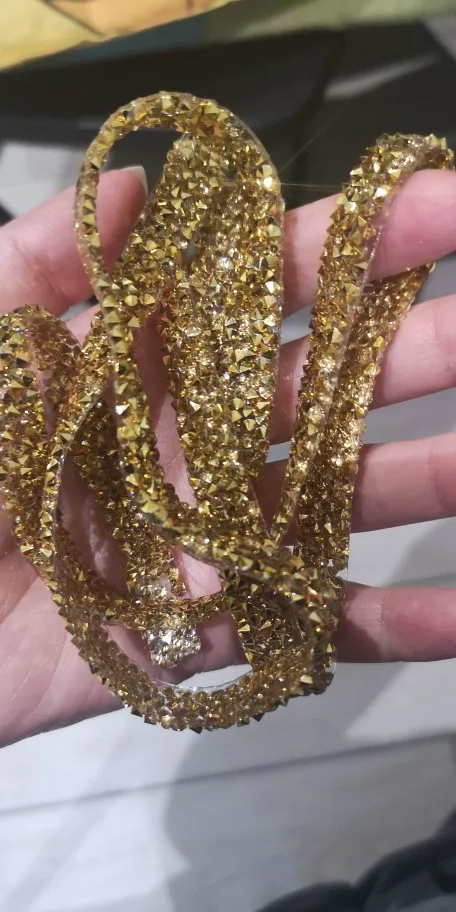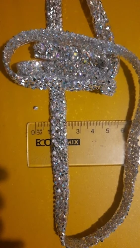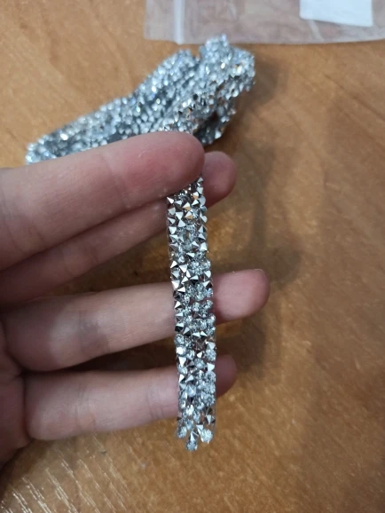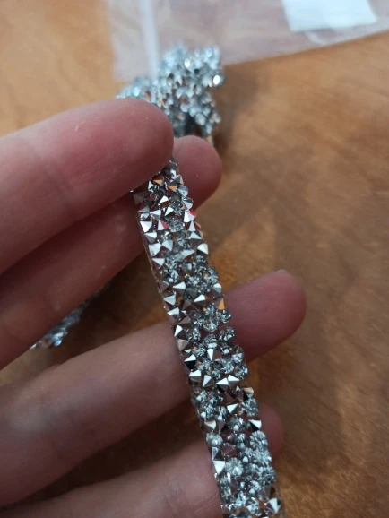 Доставка сравнительно быстрая. Ленту со стразами приложила на ткань, смотрится очень красиво, дорого и благородно. Пока не приклеивала, продавец пообещал написать инструкцию, как лучше и правильно приклеить к ткани. Продавцу большое спасибо!