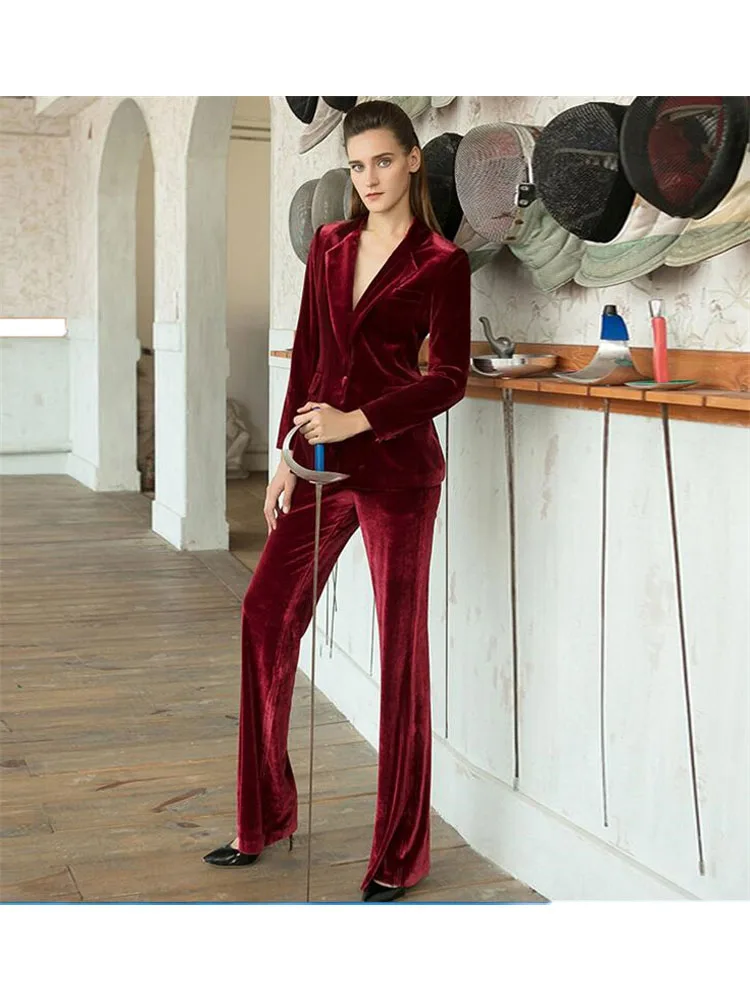 Женский бархатный костюм бордового цвета, Деловой брючный костюм из...