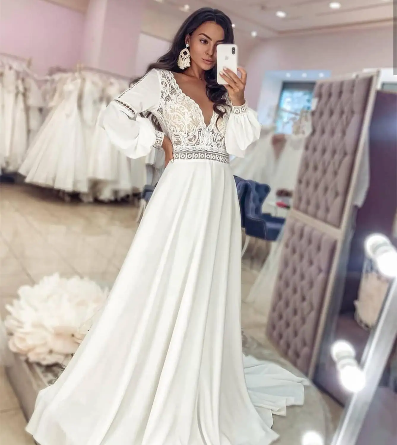 Свадебное платье с длинным рукавом 2021 Chiifon, белое богемное свадебное платье с V-образным вырезом и поясом, на заказ