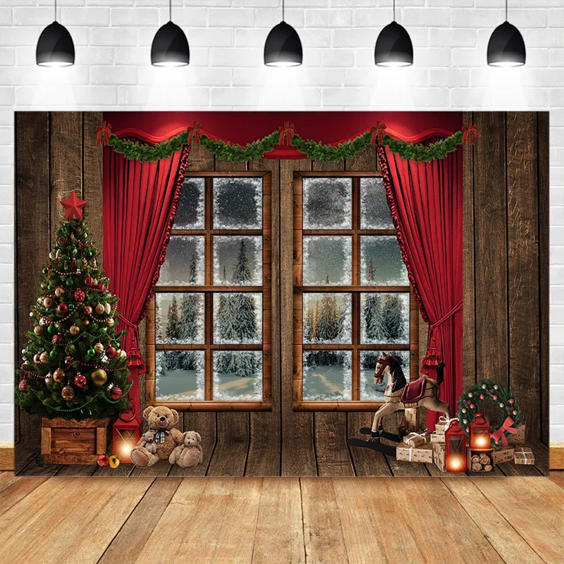 Mocsicka Рождество снег фотография фоны окно красная занавеска фотостудия фотография Декор медведь для рождественской елки