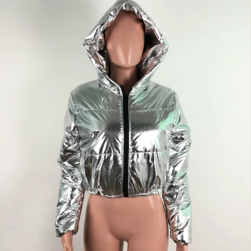 Светоотражающая Серебристая зимняя куртка, женские праздничные теплые пуховые парки с капюшоном, укороченное пузырьковое пальто, женская пуховая куртка