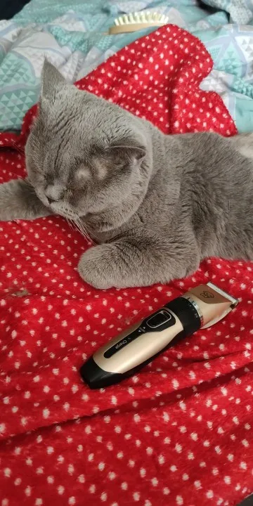 Машинка пришла за 2 недели, причём курьер на дом привёз. Очень порадовало. Конечно, машинка не совсем бесшумная, но мой пугливый кот её не напугался. В комплекте несколько насадок разной длины, но они мне вряд ли пригодятся - стригла без насадок (не под ноль бреет). На фото не окончательная стрижка Покупкой очень довольнап.с. Этой машинкой доже людей стричь можно, наверное. Так что 2 в одном)