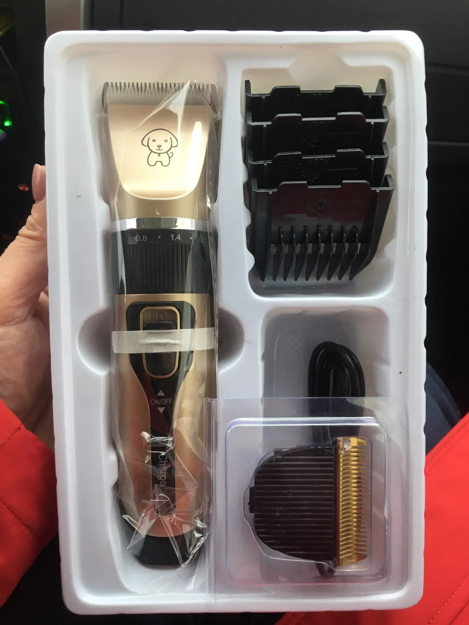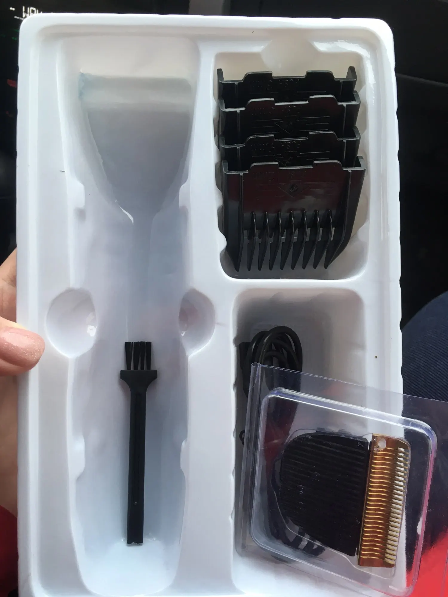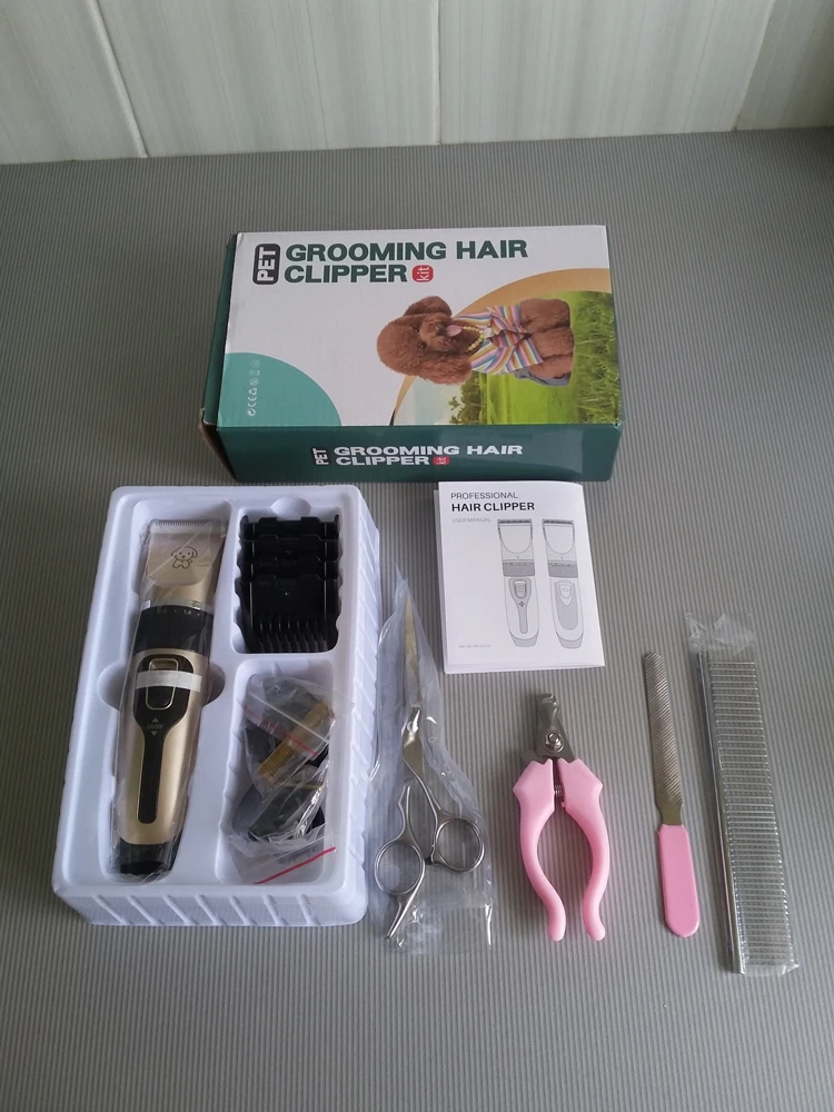 Машинка приехала в целости и сохранности. В наборе есть когтерез, ножницы,расческа. качество хорошее.
