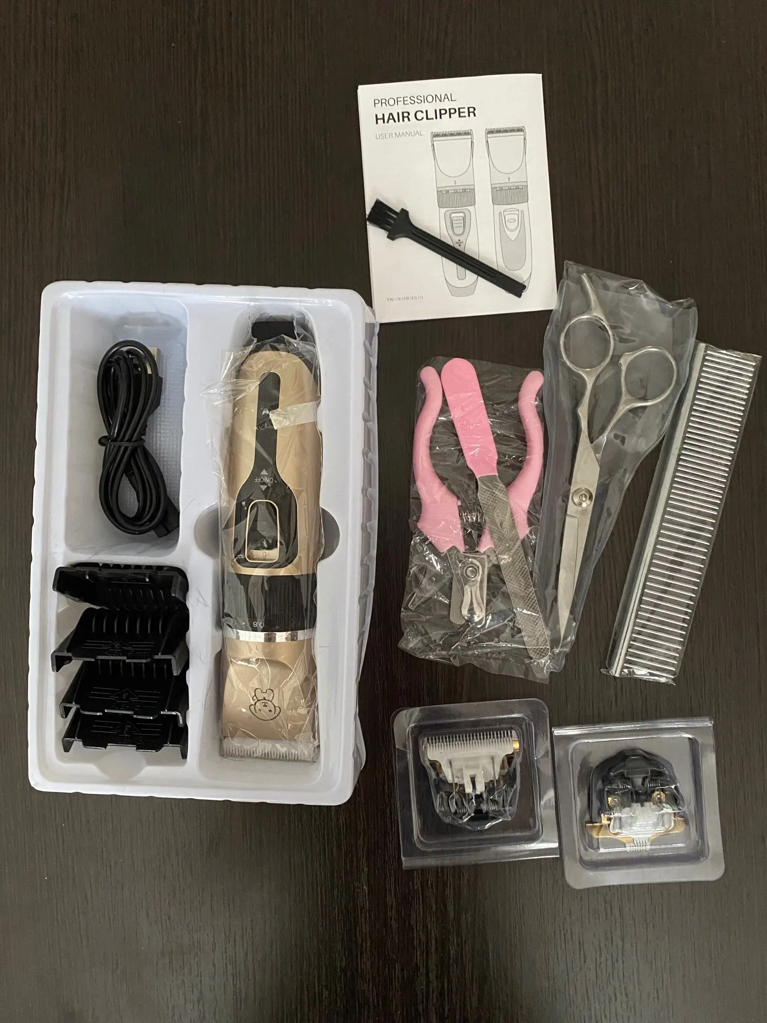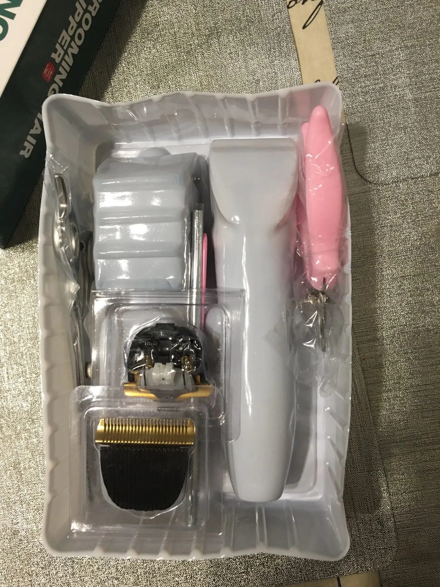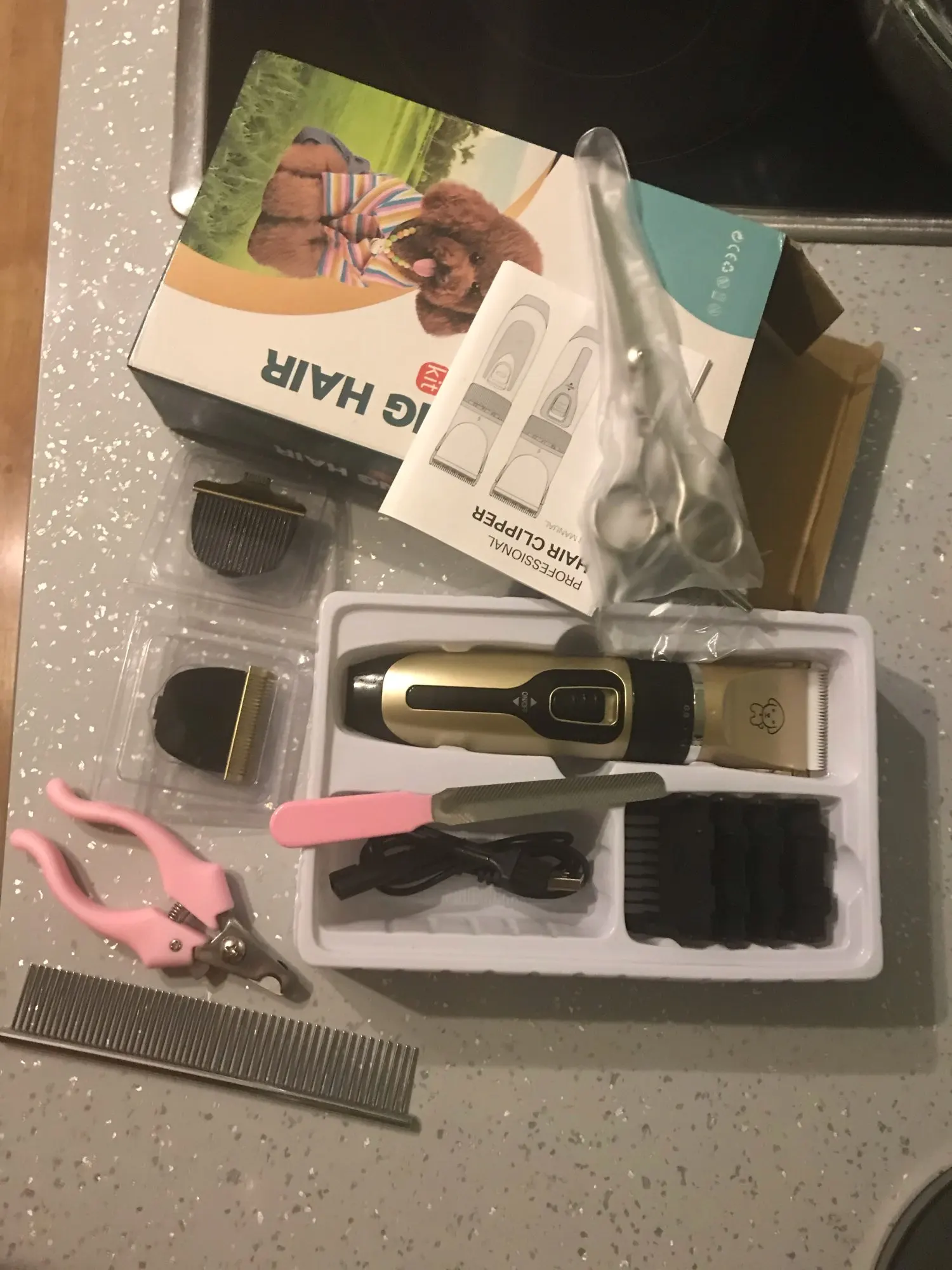 Машинка приехала в целости и сохранности. В наборе есть когтерез, ножницы,расческа. качество хорошее.