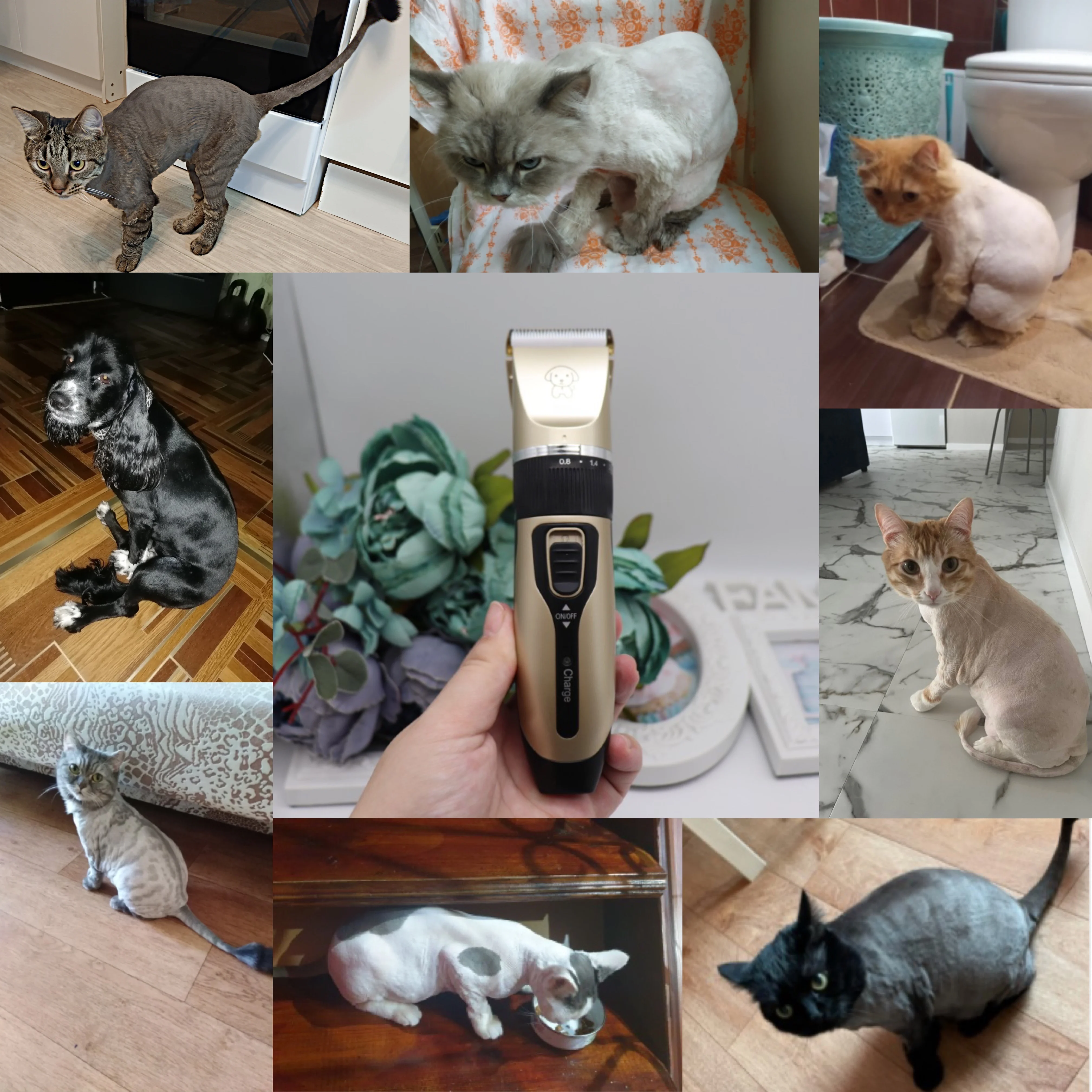 Восхитительный набор! покупала машинку для стрижки собаки и гигиенических стрижек кошек. все животные длинношерстные, у собаки жесткая шерсть, а у кошек очень мягкая, подстригла всех. машинка достаточно тихая, чтобы не пугать кошек и собаку (которая очень боится стрижек). на стрижку собаки ушел 1 час из которых 20 минут мы стригли ножницами из набора. теперь по порядку 1) у меня есть 4 разных машинки для стрижки людей, все они гораздо громче этой и сильно пугают животных. 2) стрижет шерсть как горячий нож по маслу, ножи керамические. маленькой насадкой стричь шерсть между пальцев собаке на много удобнее, чем ножницами или обычной насадкой. 3) кусачками для когтей сделали маникюр кошкам без криков и догонялок! Итог: доставка за 4 дня, набор супер! для домашнего ухода за животными отличный выбор, очень рекомендую к покупке! фото собаки до и после стрижки