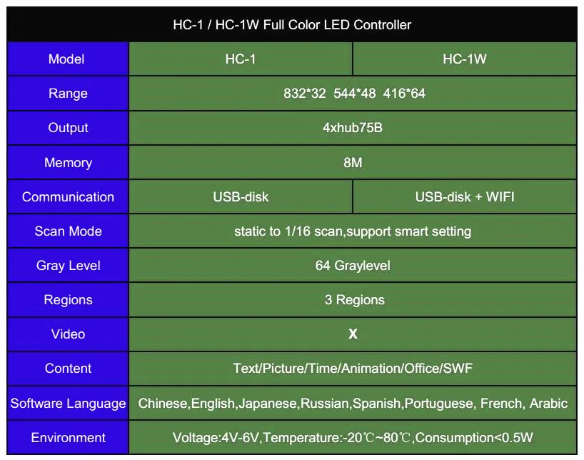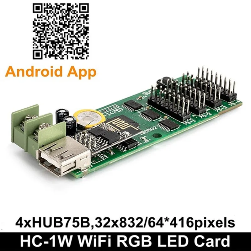 HC-1W WI-FI карты: Эта карта предназначена для просмотра текста RGB, одноцветных и двухцветных изображений отображения времени анимации, Диапазон управления: 832*32 544*48, 416*64 Режим 3. Связь: usb-диск Интерфейс модуля: HUB75 X 4 HUB08 полноцветный (требуется плата адаптера) X 8 Характеристики: Wi-Fi и u-диск, поддержка динамического фона, аналоговые часы, ослепительный текст, Фотографии, GIF, флэш-памяти, интеллигентая (ый) настройки, четырёхъядерный 64-разрядный процессор уровня серого уровня, Кнопка выбора программы Рабочая температура: -30-70 ℃ Физический размер: 92 мм * 31 мм * 15 мм/3,6 "* 1,2"