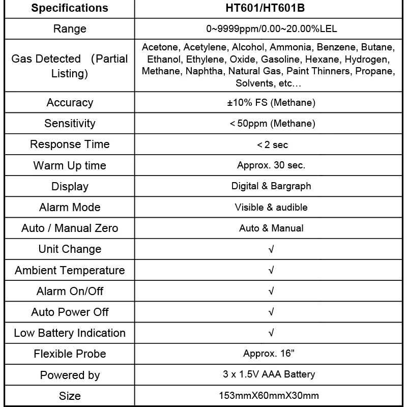 Диапазон: 0 ~ 9999ppm/0,00 ~ 20.00% LELОбнаружение газа: горючий газТочность: ≤ 10% FS (метан)Чувствительность:<50ppm (метан)Время отклика:<2 секВремя разогрева: прибл. 30 секДисплей: ЖК-дисплейРежим сигнализации: Видимый, звуковойАвтоматический/ручной ноль: автоматический или ручной нольАвтоматическое отключение питания: √Индикация низкого заряда батареи: √Гибкий зонд: 16 дюймовМощность: 3x1,5 батарейки типа AAA