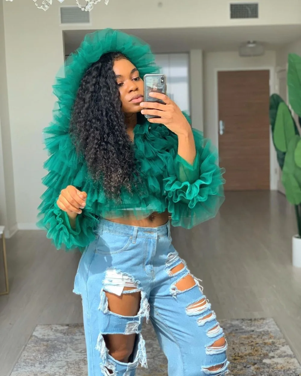 Зеленые тюлевые топы с оборками и шапкой, топы с длинными рукавами, рубашки, Короткие блузки, пушистые топы из тюля, женские топы на заказ, FormalTop