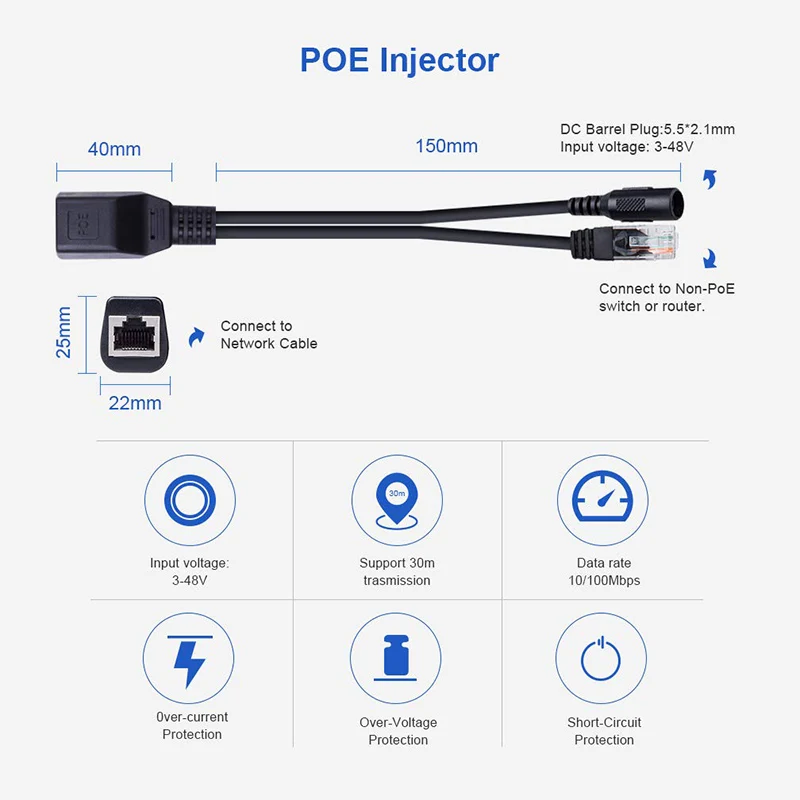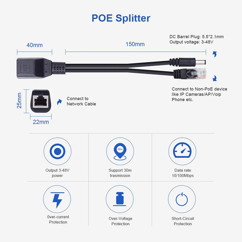 Этот комплект содержит как очень экономичный инжектор, так и разветвитель. Инжектор вставки напряжения постоянного тока в качестве источника расположение в 5,5 мм x 2,1 мм заглушка инжектора,Затем напряжение постоянного тока проходит через запасные пары сетевого кабеля 10BASE-T или 100BASE-T к стороне сплиттера,И разветвитель сплит напряжения постоянного тока от сетевого кабеля в 5,5 мм x 2,1 мм DC jack.