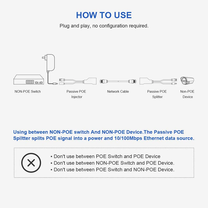 В этом комплекте требуется внешний адаптер питания для питания устройства.Пассивный Инжектор PoE и набор разветвителей PoE обеспечивают низкую стоимость доставки питания по сетевому кабелю для более коротких расстояний.Этот комплект позволяет переносить питание в 10/100 сетях через запасные, неиспользованные пары сетевого кабеля CAT5, CAT5E, CAT6 или CAT7 Ethernet. На более коротких длинах сети источник питания может питать беспроводную точку доступа, ip-камеру видеонаблюдения, ip-телефон и т. д.