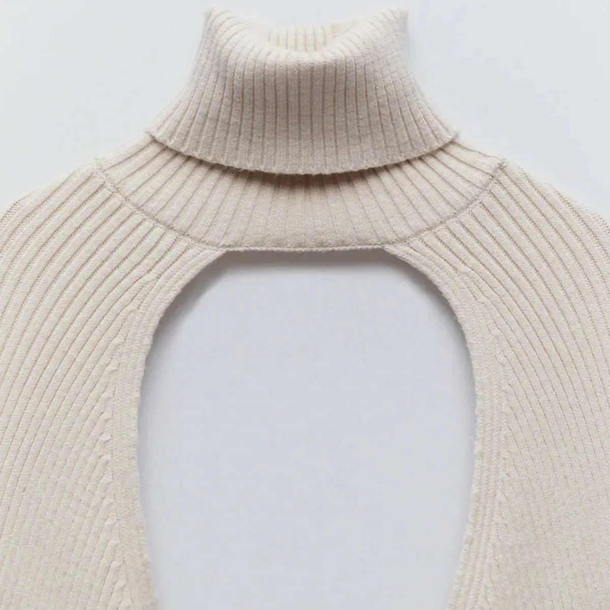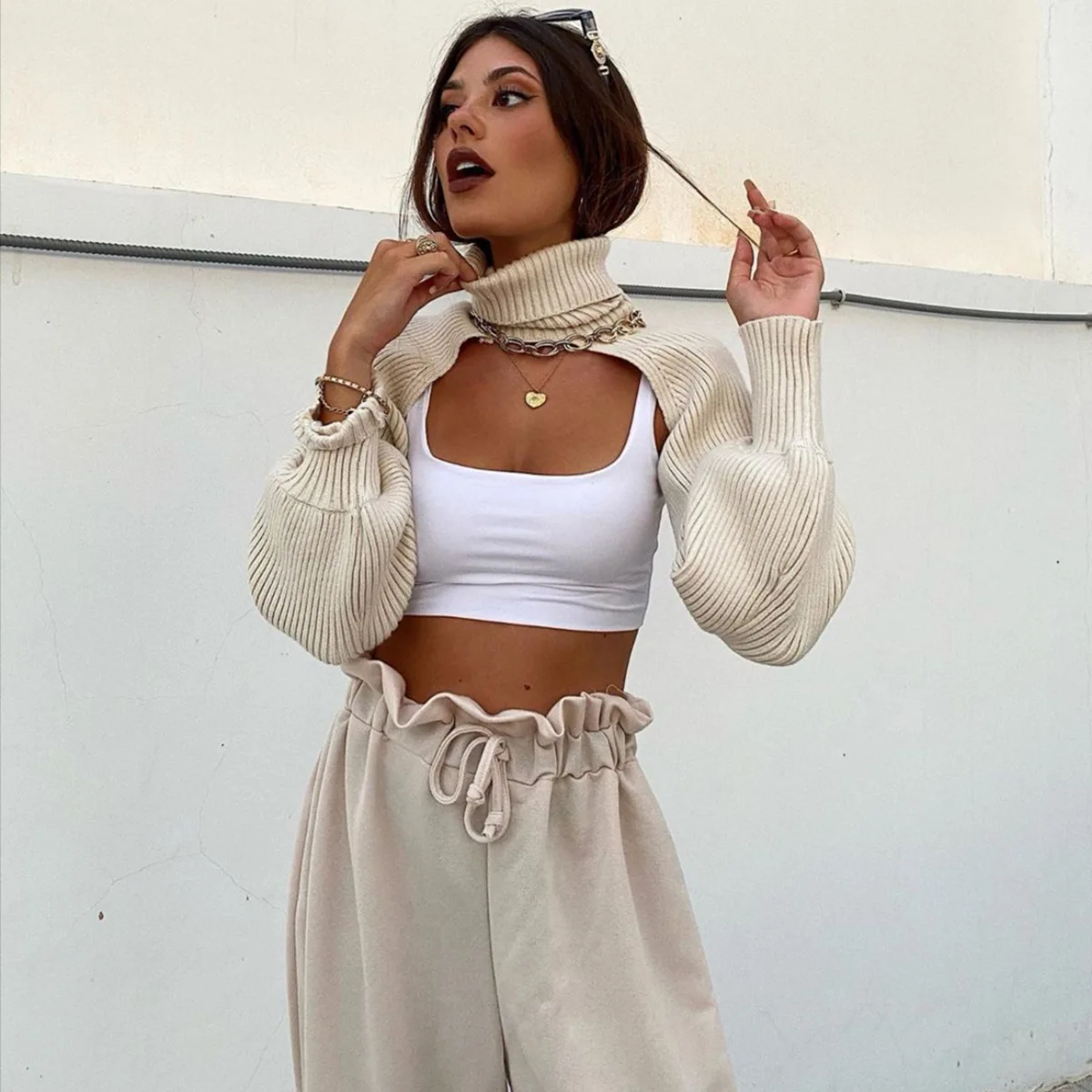 Свитер женский трикотажный однотонный с высоким воротником и длинными рукавами-фонариками, на осень