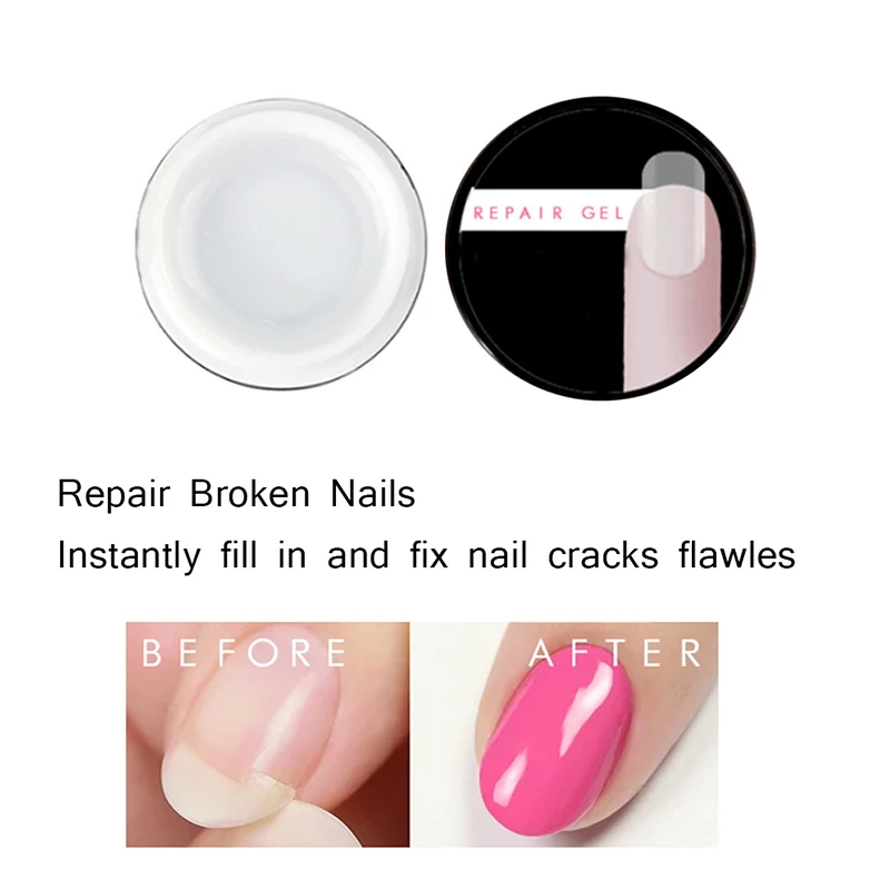 ❤Могу ли я нанести лак для ногтей после его ремонта? Да! После маникюра вы можете нанести лак для ногтей, замочить гель-масло или даже 3D украшение для ногтей по желанию. Просто убедитесь, что гель полностью высыхает и полностью покрывает трещины.❤Ремонтный гель V.S. шелковая обертка для ногтей? Нужно обрезать гвоздь, чтобы соответствовать размеру трещин. Они также могут быть применены только для здоровых ногтевых кроватей и эмалей, чтобы обеспечить гладкий процесс окраски. Но наш гель для ремонта может использоваться без сложного процесса. Он также может гибко заполнять трещины ногтей любого размера-один слой должен быть применен к крошечным трещинам, и больше слоев должны быть применены к более крупным трещинам. Характеристика: