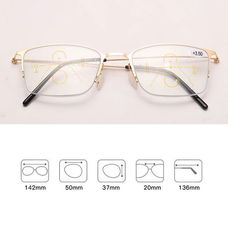 Металлические прогрессивные многофокальные очки для чтения для мужчин и женщин, модные золотые очки с полуободковой оправой с гиперопическими анти-синими лучами