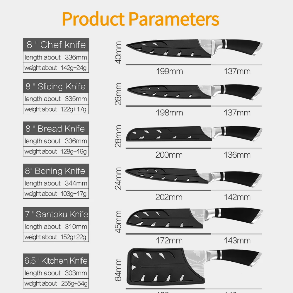 XYj профессиональный набор ножей из нержавеющей стали в японском стиле с ножнами ножи для мяса рыбы кухонные ножи сантоку поварской набор для измельченияТехнические характеристикиМатериал клинка: нержавеющая стальМатериал рукоятки: нержавеющая сталь + ABS ОсобенностиОн предназначен для высококачественной кухонной посуды и должен быть вашим лучшим выбором для кухонной жизни. Внимание!1. Пожалуйста, не вставляйте диспенсер.2. Храните его в недоступном для детей месте.3. Пожалуйста, не держите край и точку ножа целиком по отношению к людям.4. Пожалуйста, не ловите нож вручную, когда нож опускается.5. Очистите и высушите нож после использования и поместите его в сухое место.6. Лезвие очень острое, пожалуйста, не используйте палец для проверки остроты ножа.7. Из-за различных методов измерения и партии продукции размер и вес продукта могут иметь небольшую погрешность.