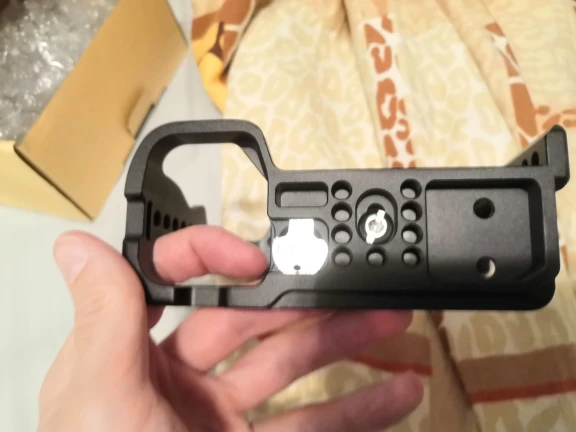 Интересная клетка. Мне кажется надёжной. Камера сидит аккуратно. Нравится то, что есть упор спереди. Решение не делать дырок слева внизу, на площадке - плохая идея. Ну и расположение левого башмака спорно. Ещё есть классный болтик для фиксации камеры к клетки за ушко ремешка камеры. Я пока не понял, как снять ремень, но прикольно. К эргономике можно привыкнуть. Монетка на магнитик и салазках внизу - очень хорошая идея.
