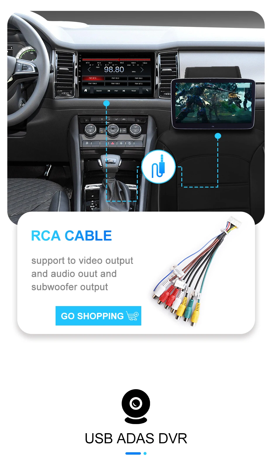 >>> Поддержка входа видео / AUXПоддержка видеовыхода, вы можете смотреть видео на внешнем монито ре, таком как монитор подголовника, потолочный монитор (кабель RCA н е входит в комплект, можно нажать, чтобы купить)