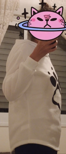 bluza szersza niż dłuższa. sztuczny materiał, ogromny kaptur.