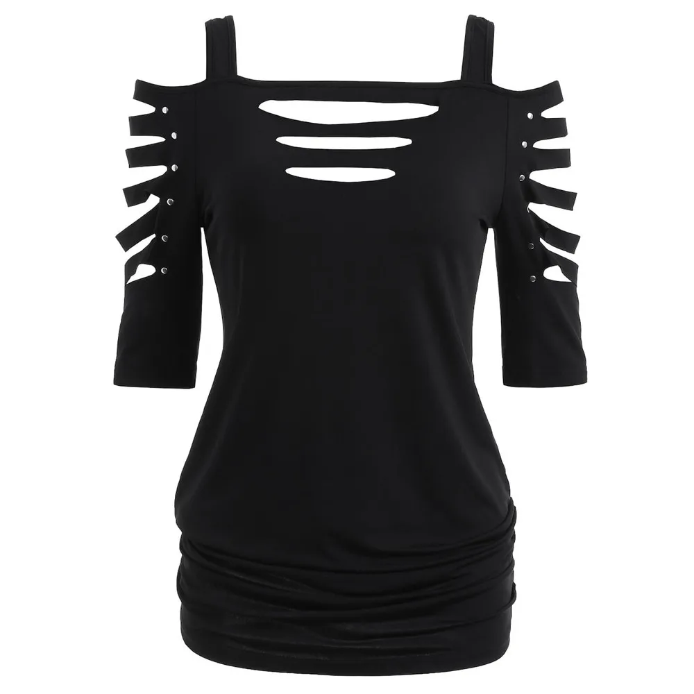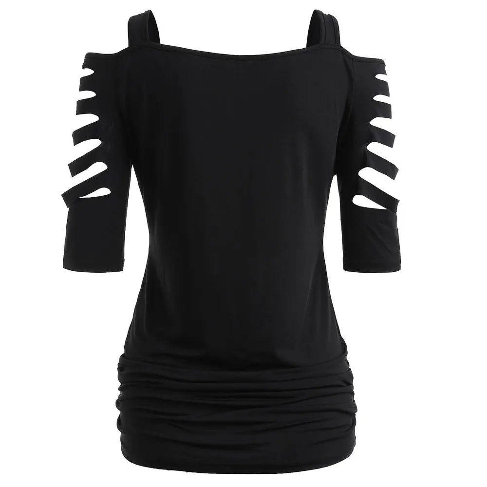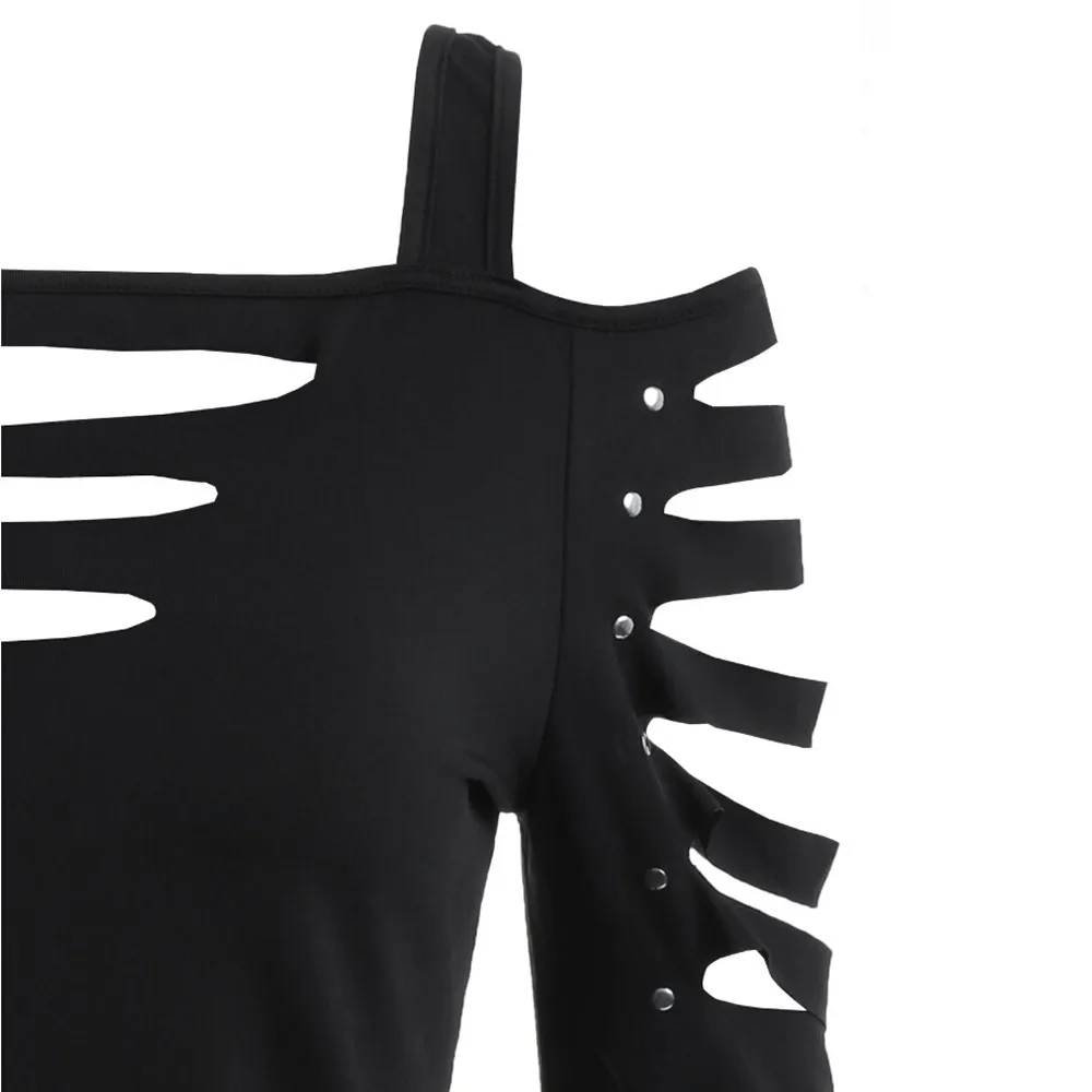 Женская хлопковая футболка, летняя, черная, с вырезом на плече, в готическом стиле