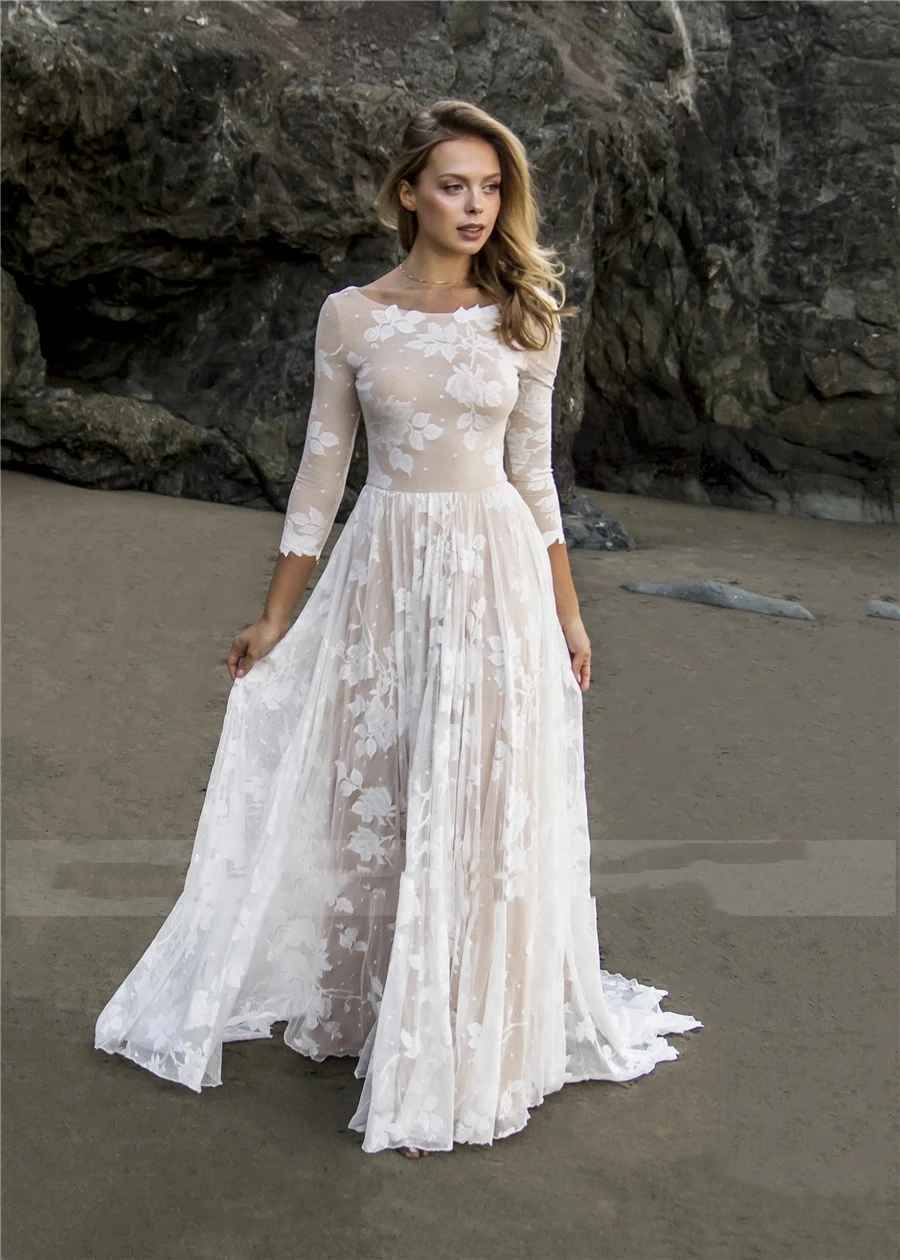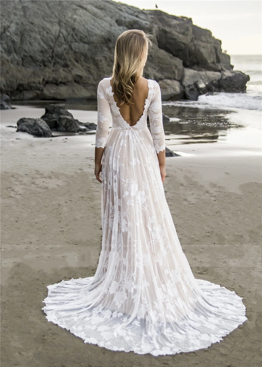 Сексуальное платье с открытой спиной цвета шампанского, цвета слоновой кости, кружевное пляжное свадебное платье в стиле бохо, 34 с длинным рукавом, очаровательные богемные Свадебные платья с открытой спиной, Vestidos