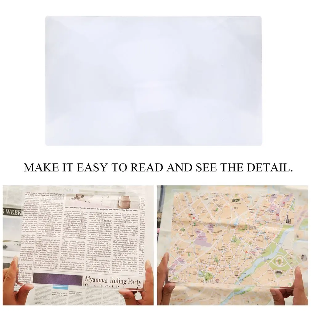 Особенности: Портативный размер, легко носить с собой и использовать.Хорошо для пожилых людей.Это может помочь людям, чьё зрение не очень хорошо читать газету, документировать четко.Легко читать и видеть детали.Идеально подходит для чтения текста, меню, карт, документов и так далее. Характеристики: Материал: ПВХУвеличение: 3XТолщина: 0,5 ммРазмер: около 26x18 см Посылка: 1 x XL лист-лупа