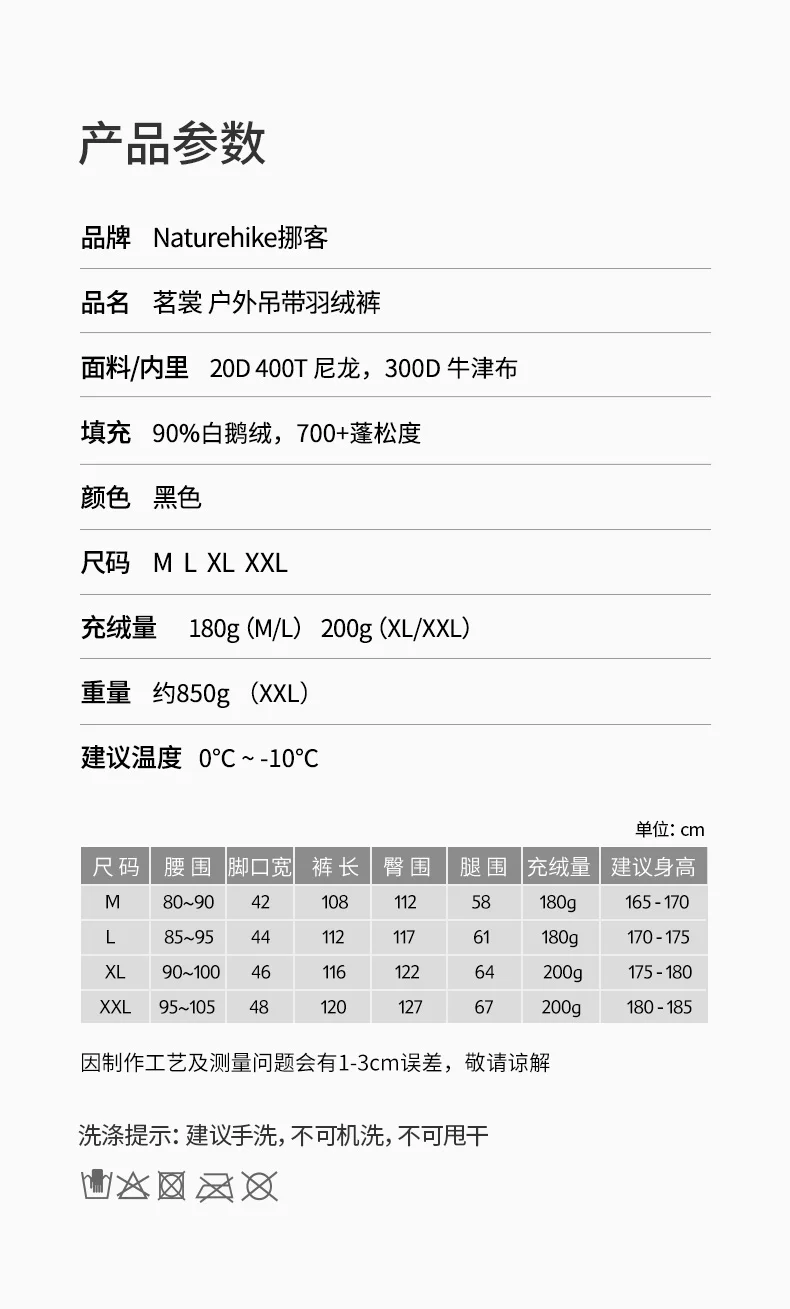 Naturehike Outdoor Winter Suspender Down Pants 90% White Goose Down 700+ Bulkiness Winter Thick Windproof And Cold Warm Pants