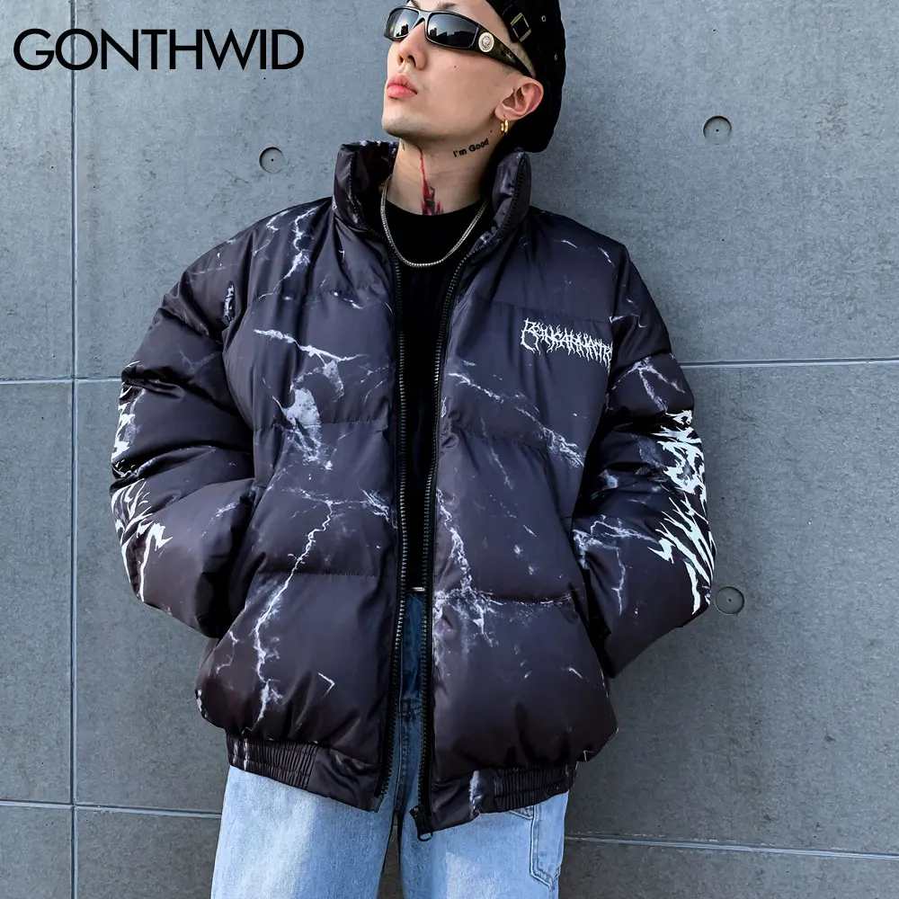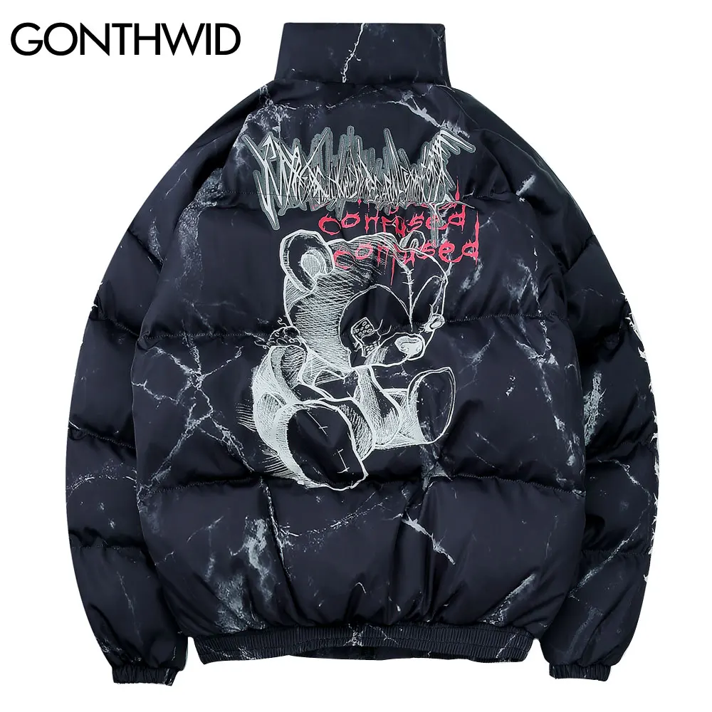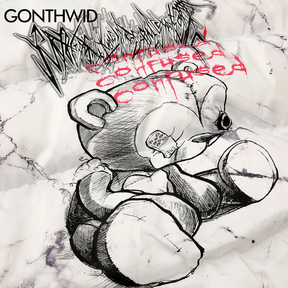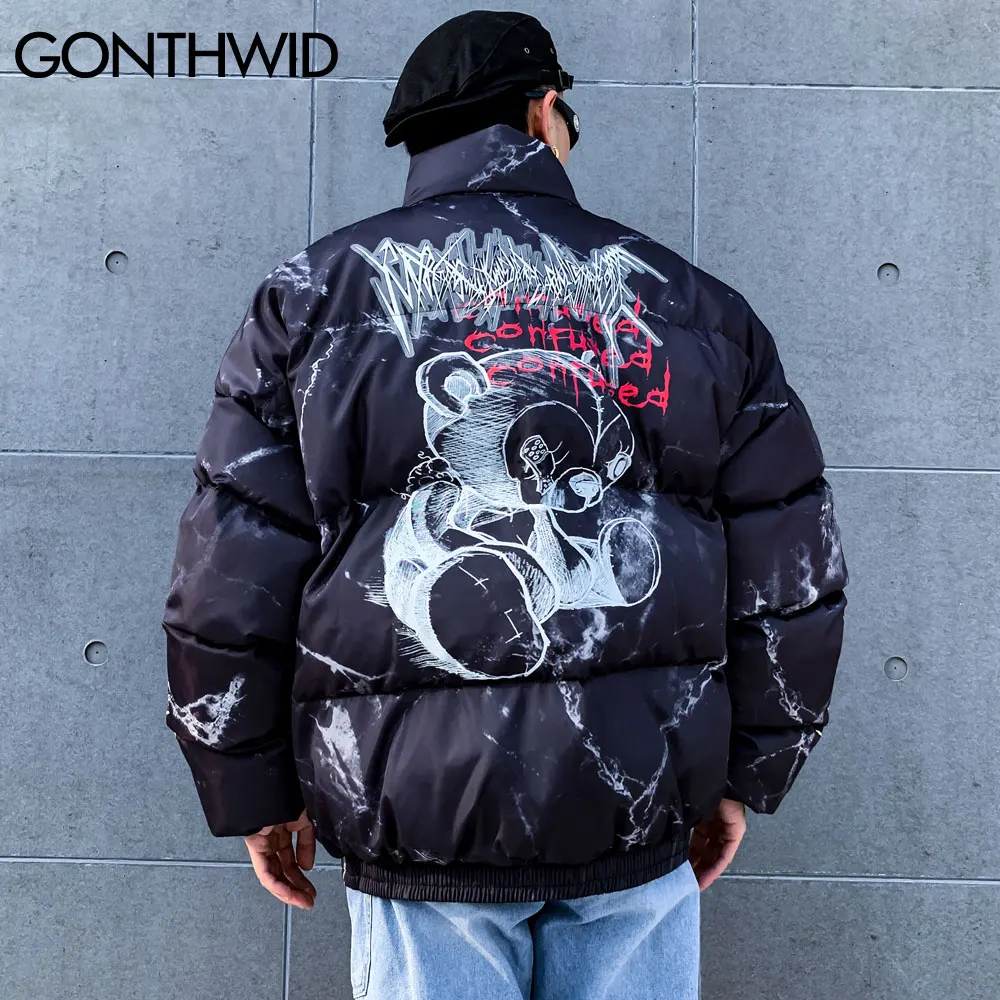 Парка GONTHWID мужская с хлопковой подкладкой, уличная одежда в стиле хип-хоп, на молнии, с принтом медведя и граффити, зимняя модная повседневная верхняя одежда