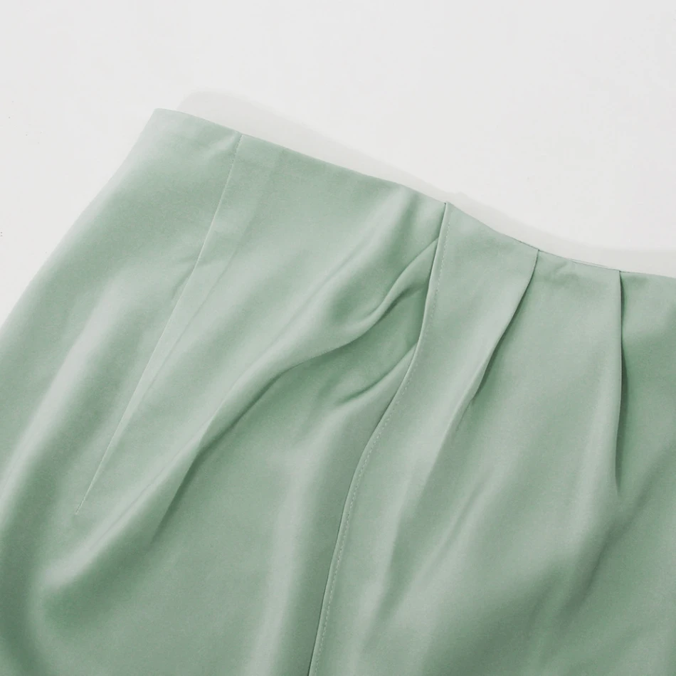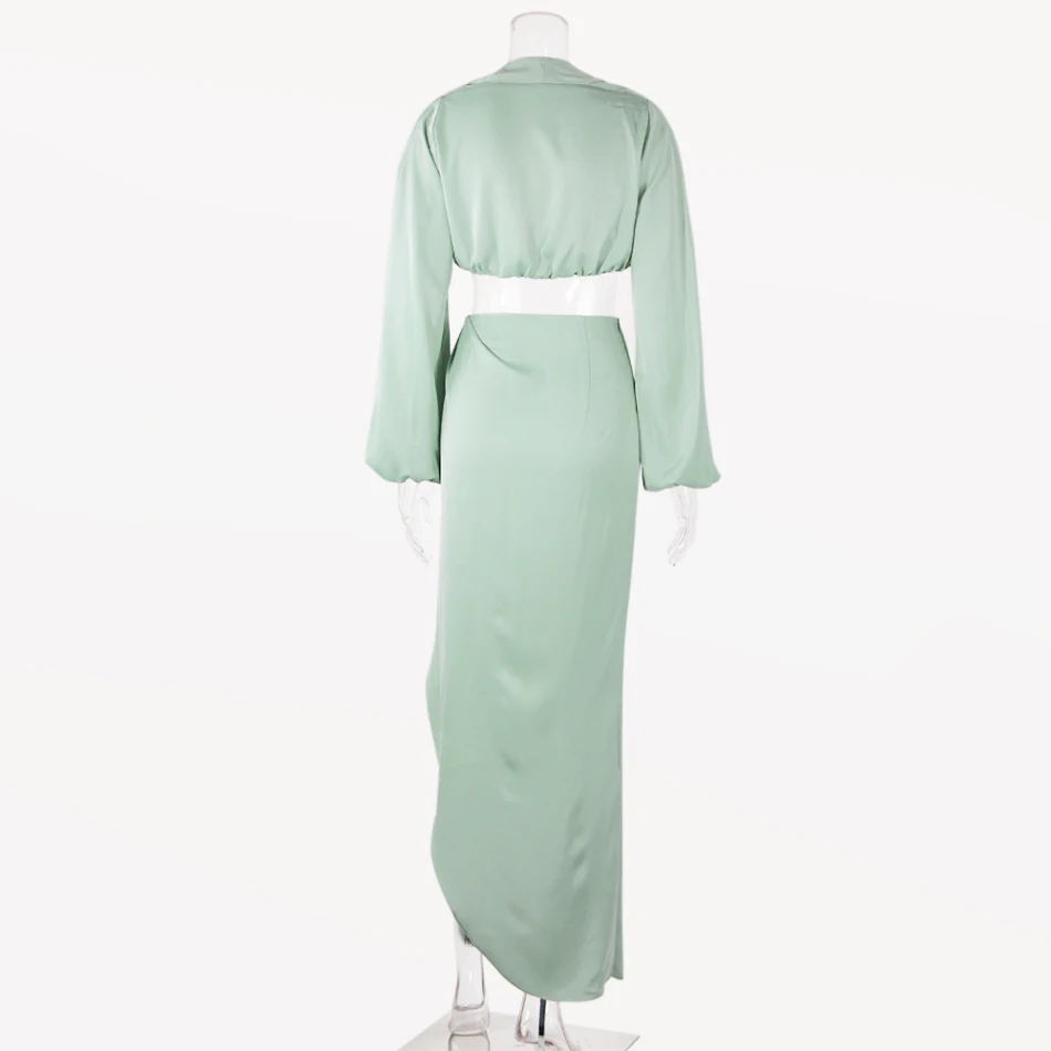Новинка, Шелковый Атласный драпированный короткий топ с длинным рукавом и юбка Meqeiss, сексуальные женские комплекты из двух предметов, модная одежда, зеленые подходящие комплекты